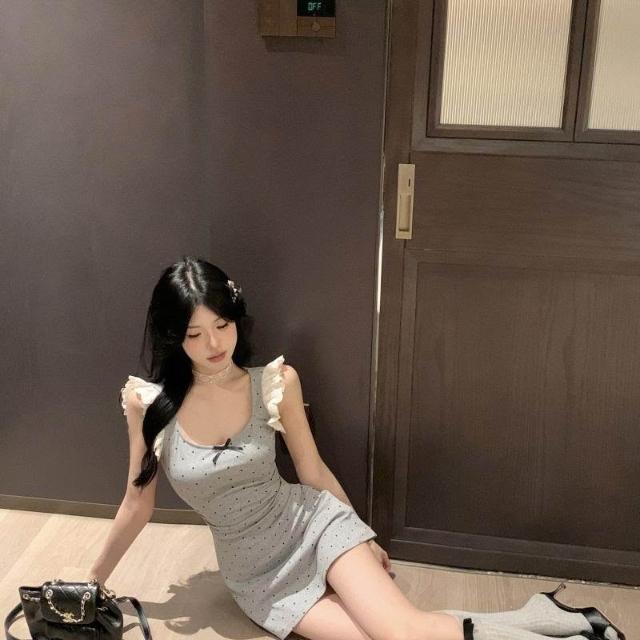 純欲風辣妹蝴蝶結波點印花花邊連衣裙小個子夏季蕾絲收腰夏天裙子