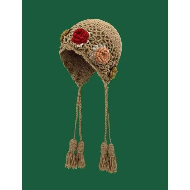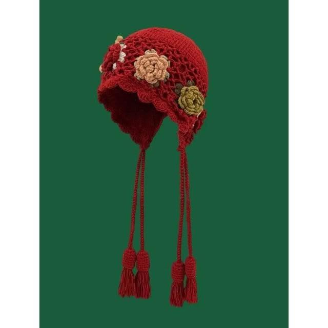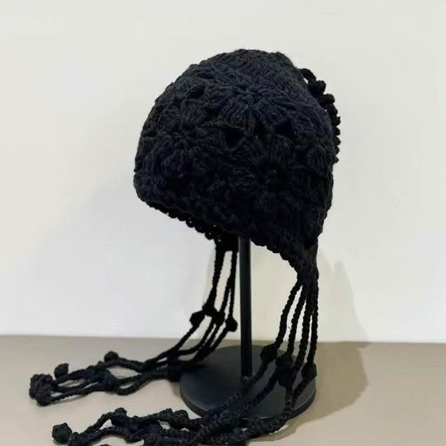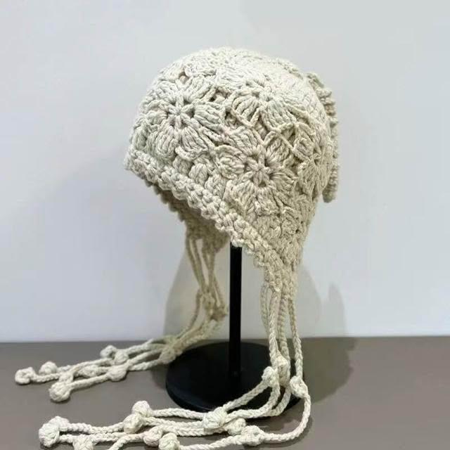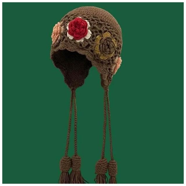 新品 含發票 新款復古文藝針織民族風镂空鉤花毛線帽手工編織包頭帽子流蘇