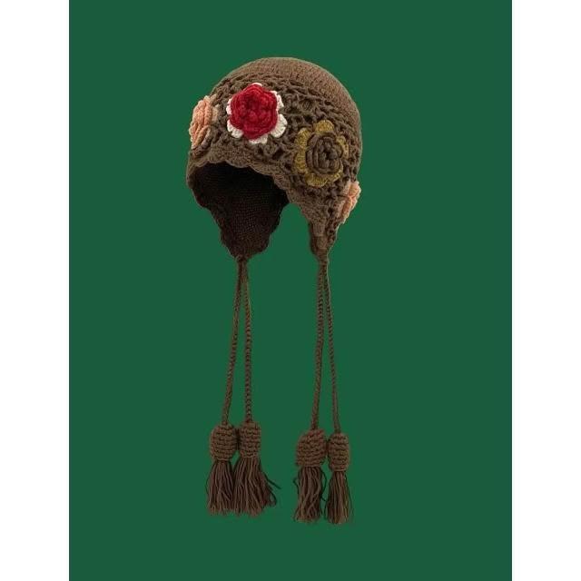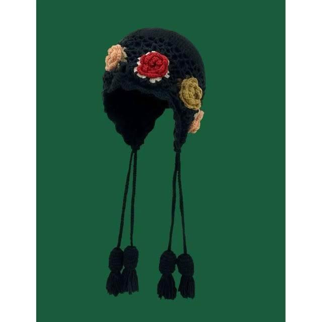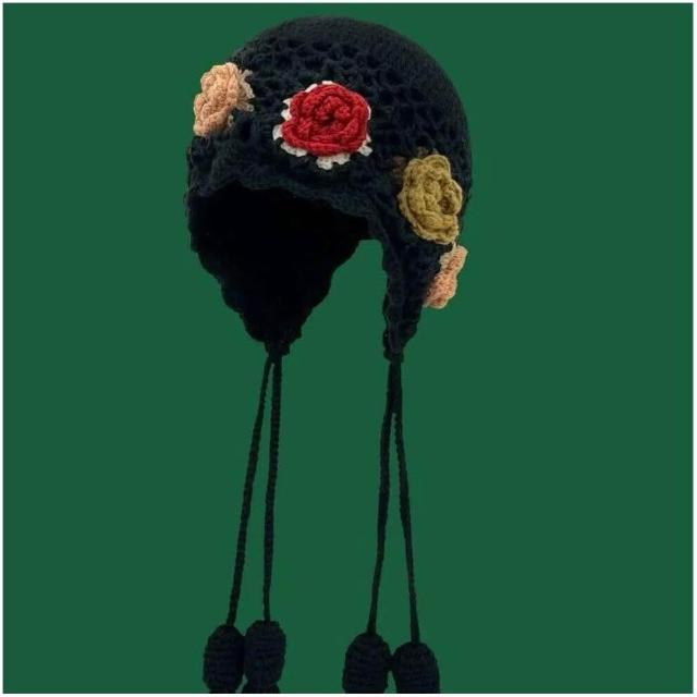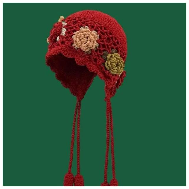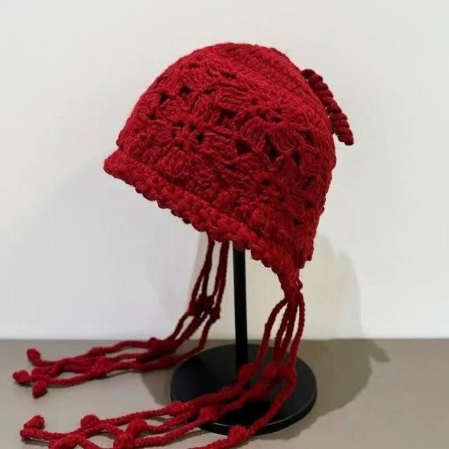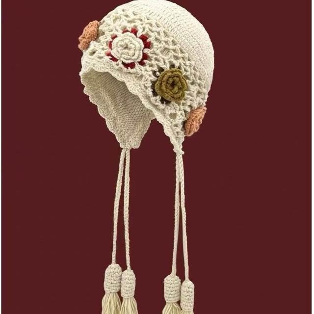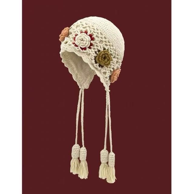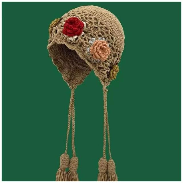 新品 含發票 新款復古文藝針織民族風镂空鉤花毛線帽手工編織包頭帽子流蘇