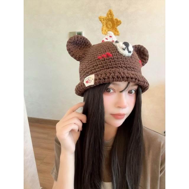 新品 含發票 2025新款純手工編織卡通小熊可愛毛線帽套頭帽閨蜜禮物潮