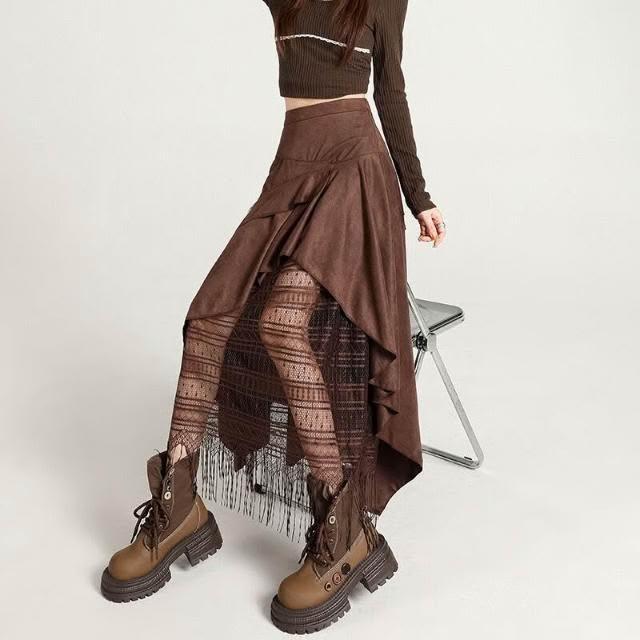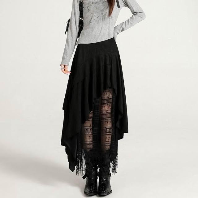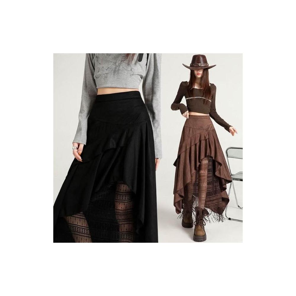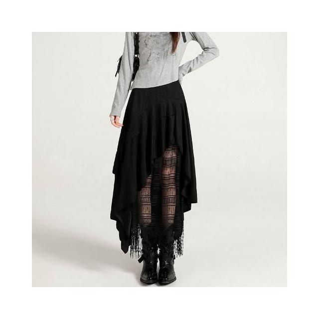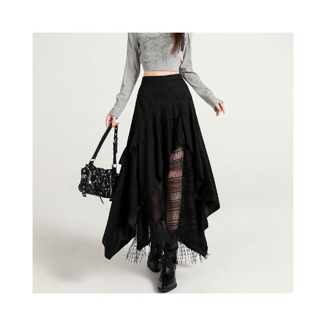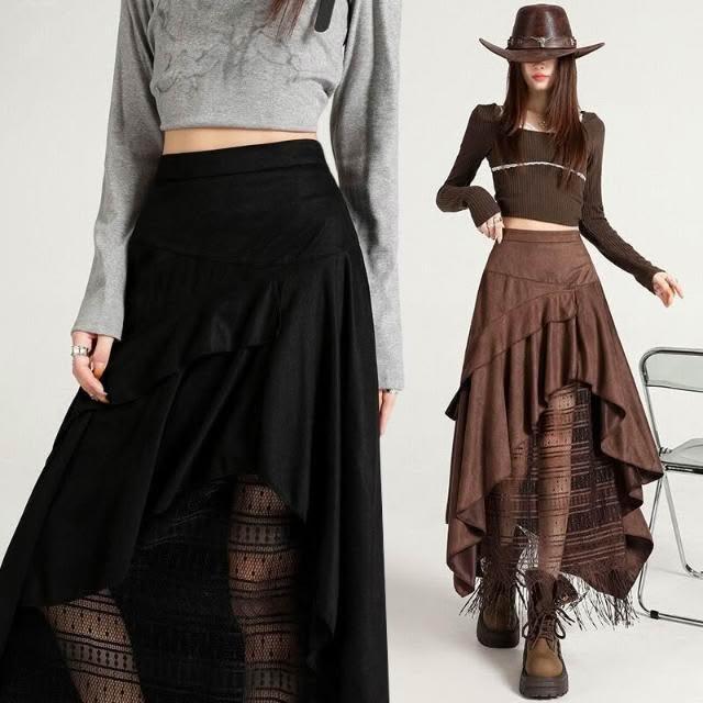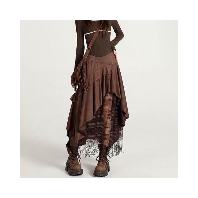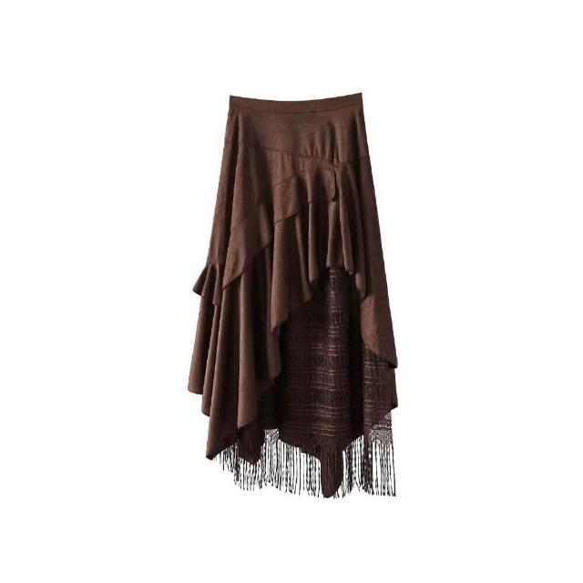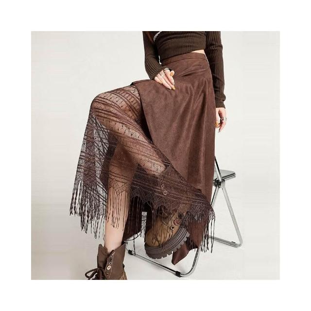 新品 含發票 實拍蕾絲拼接不規則麂皮絨半身裙女2025秋冬季高腰百搭A字裙長裙