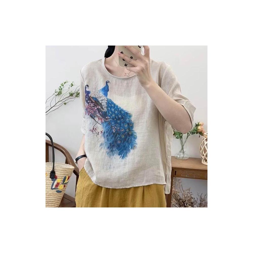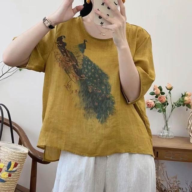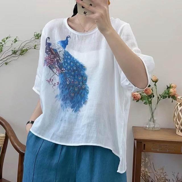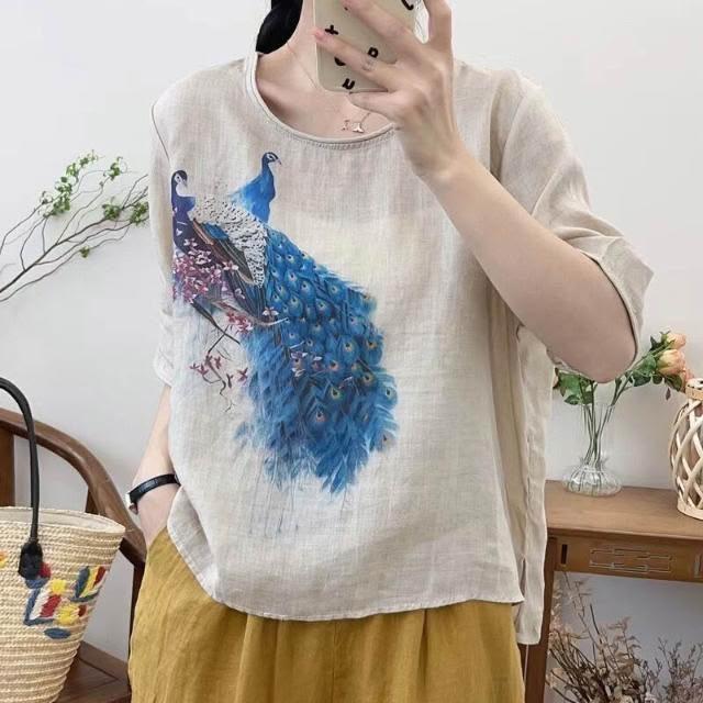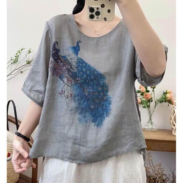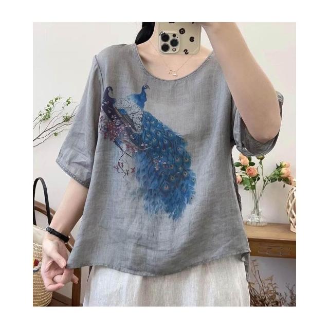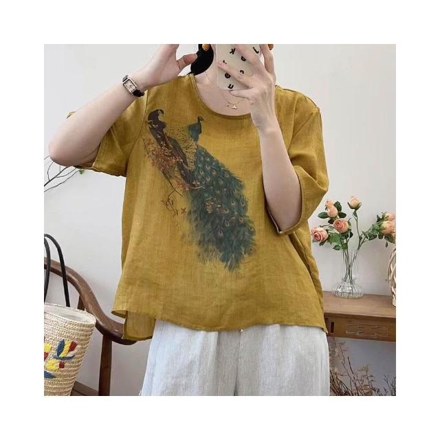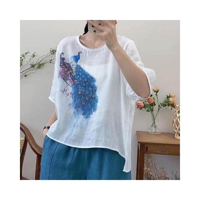 新品 含發票 復古苎麻印花T恤女寬松顯瘦圓領休閑套頭衫女裝上衣2023夏季新款
