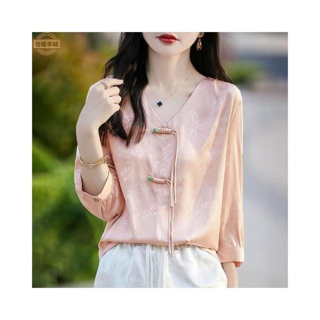 新品 含發票 夏裝新中式國風V領七分袖襯衫女夏季新款仿真絲襯衣顯瘦薄款上衣