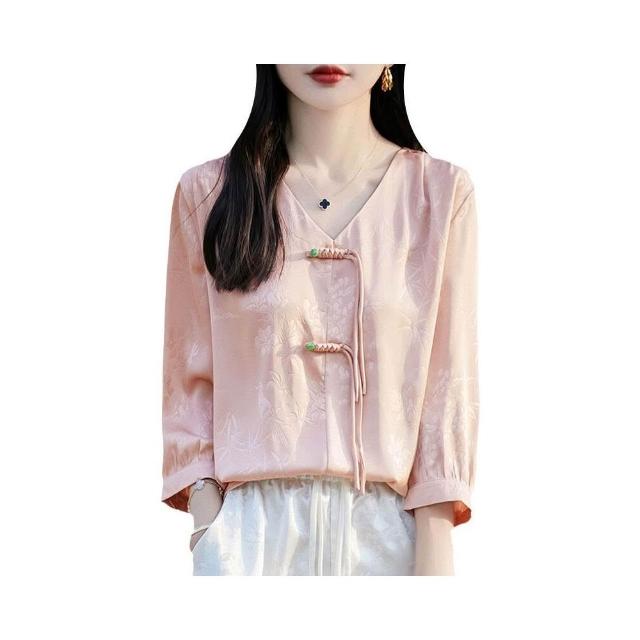 新品 含發票 夏裝新中式國風V領七分袖襯衫女夏季新款仿真絲襯衣顯瘦薄款上衣