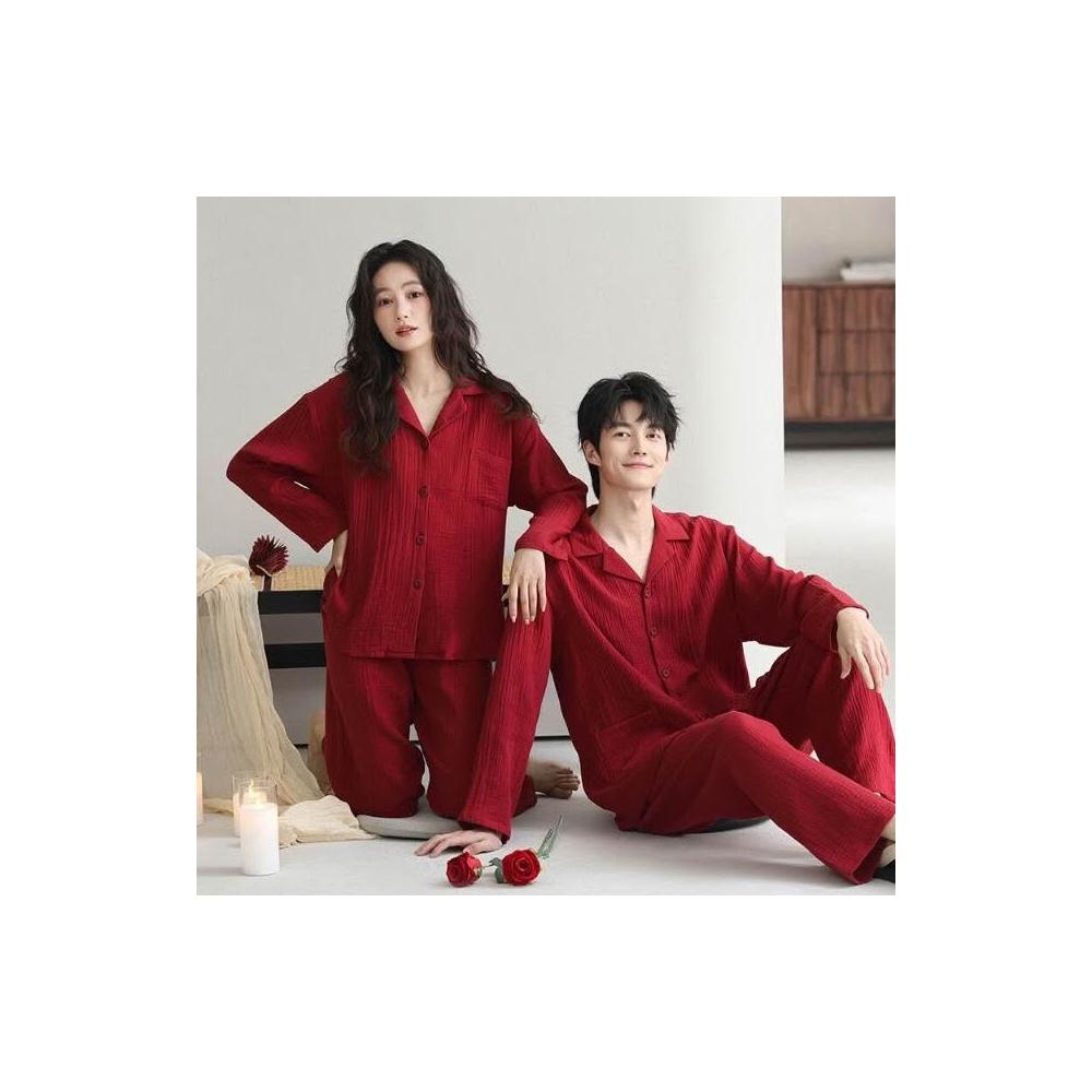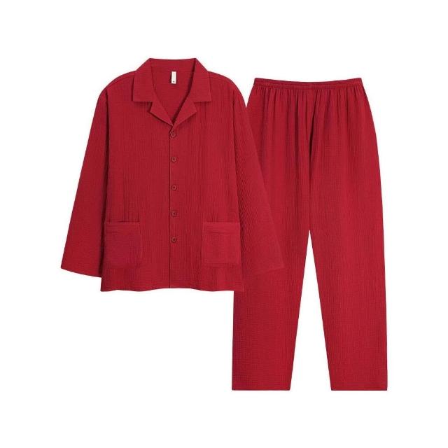 新品 含發票 本命年紅色結婚雙層紗睡衣純棉情侶長袖春夏季男女套裝家居服薄
