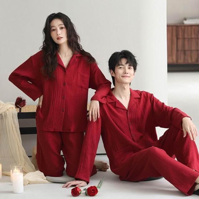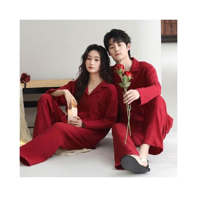 新品 含發票 本命年紅色結婚雙層紗睡衣純棉情侶長袖春夏季男女套裝家居服薄