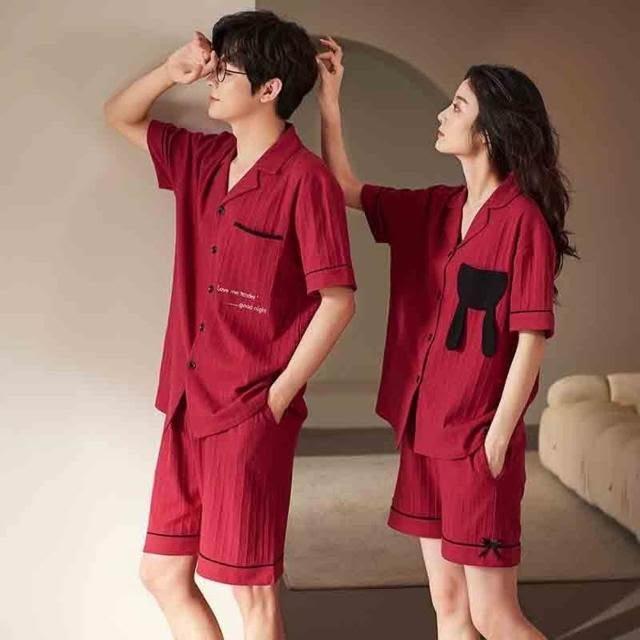 新品 含發票 情侶睡衣夏季純棉短袖男女士感2025年款新婚結婚棗紅色家居服
