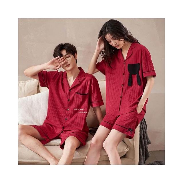新品 含發票 情侶睡衣夏季純棉短袖男女士感2025年款新婚結婚棗紅色家居服