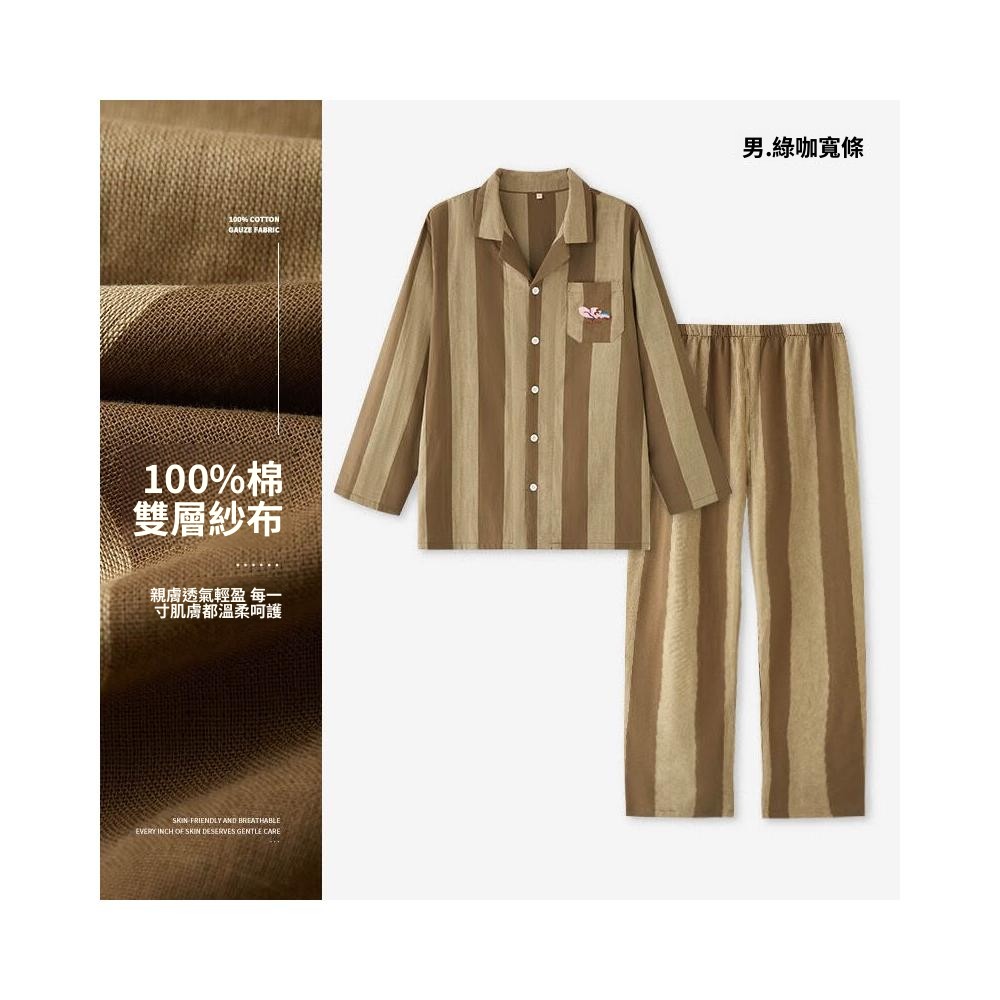 新品 含發票 情侶睡衣女無印春秋季純棉紗布刺繡條紋野獸家居服男士長袖套裝夏
