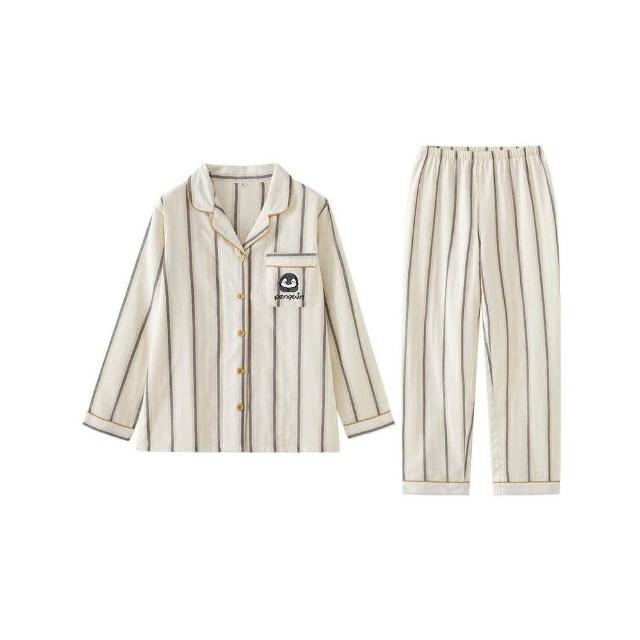 新品 含發票 情侶睡衣女無印春秋季純棉紗布刺繡條紋野獸家居服男士長袖套裝夏