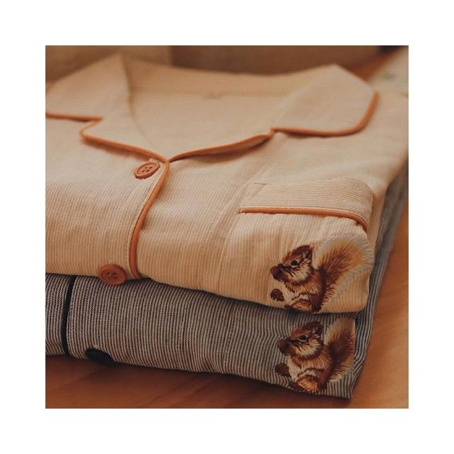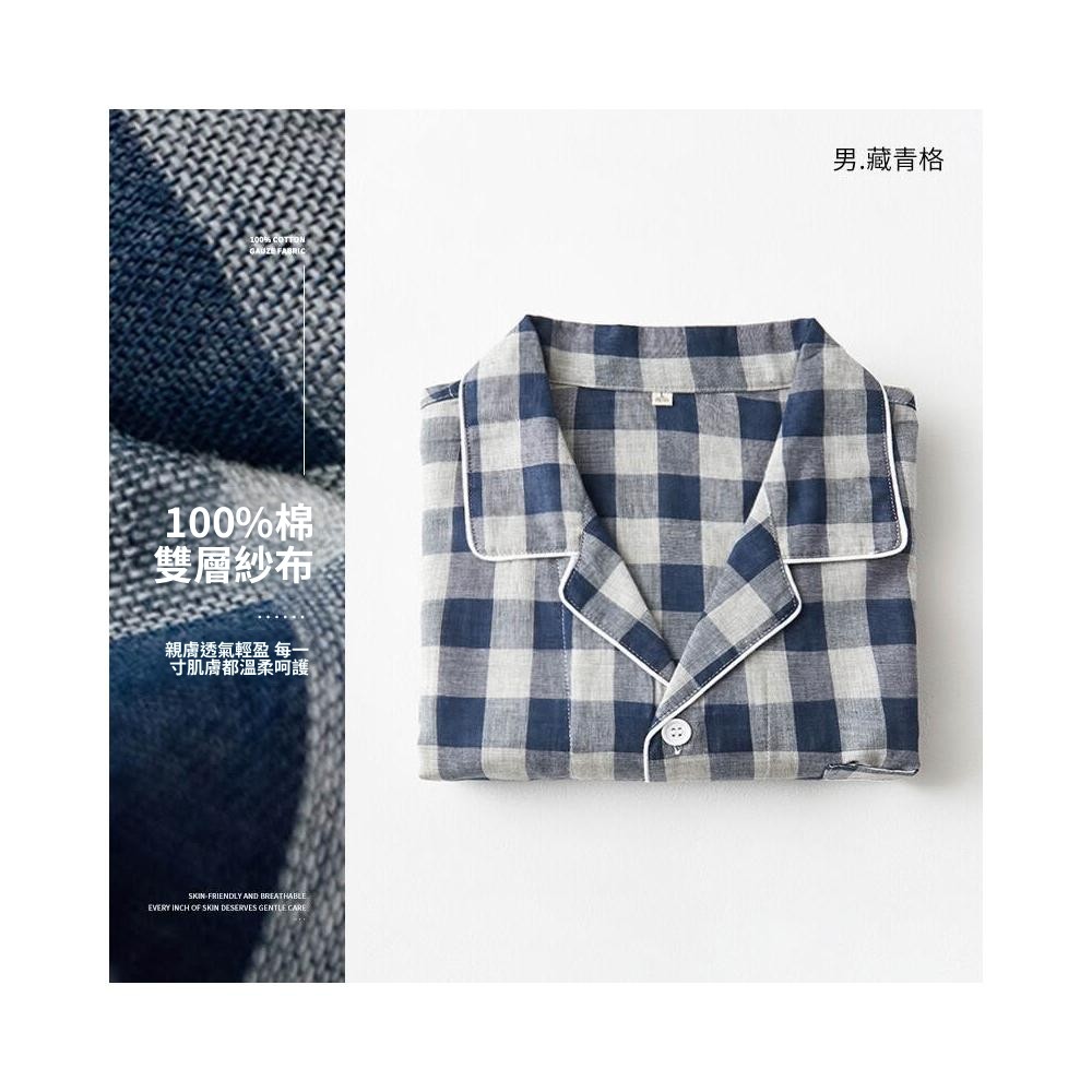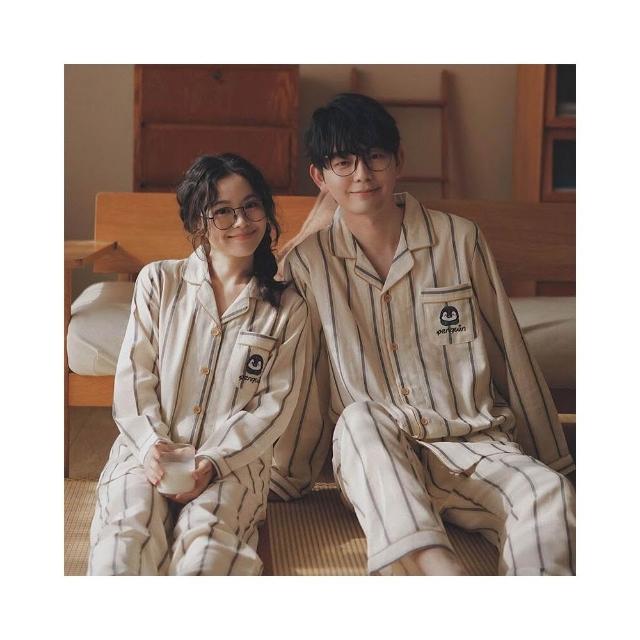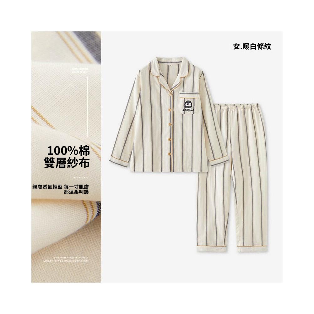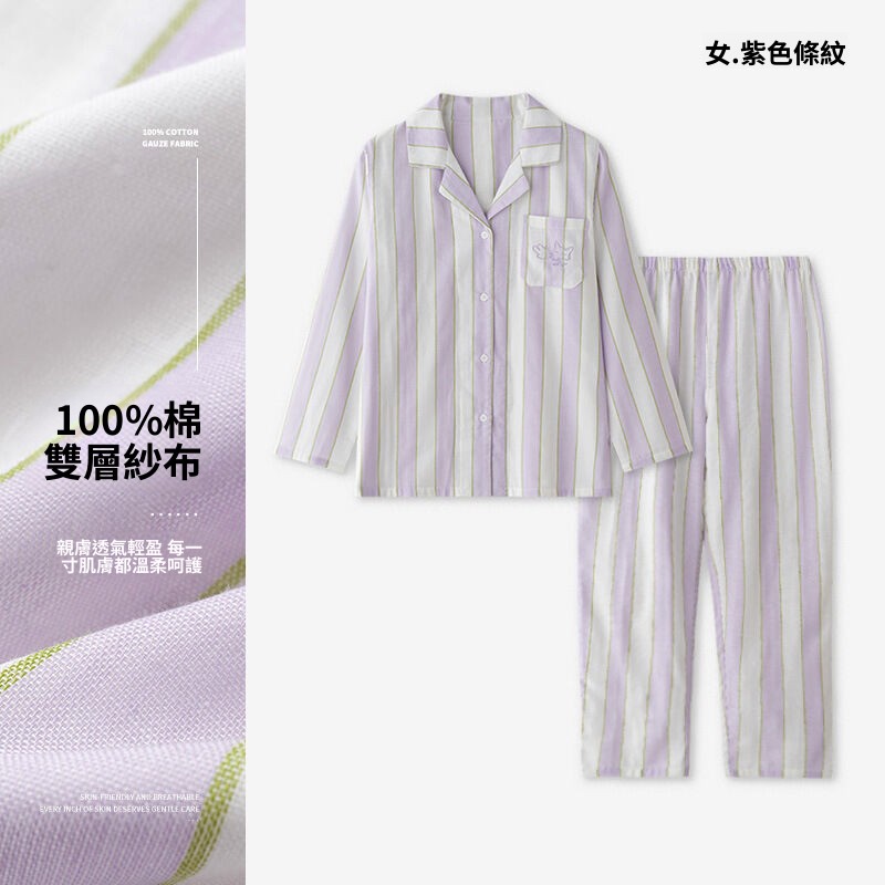 新品 含發票 情侶睡衣女無印春秋季純棉紗布刺繡條紋野獸家居服男士長袖套裝夏