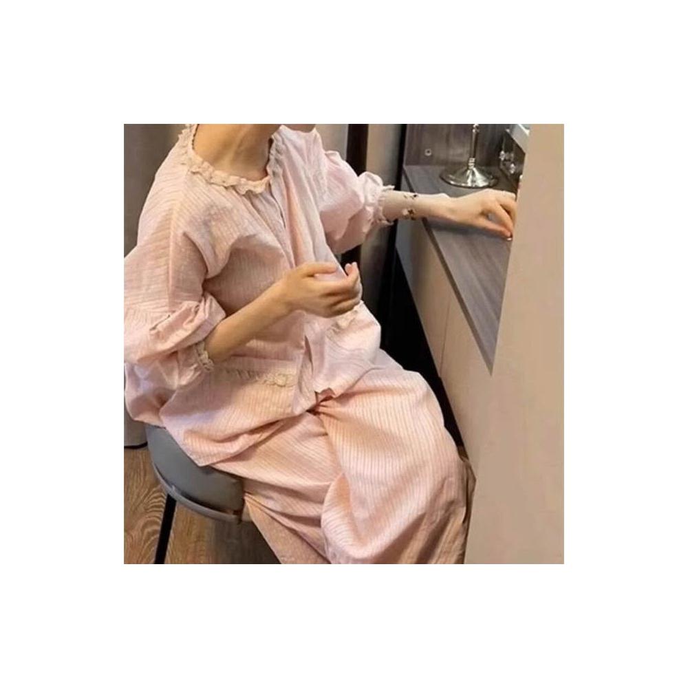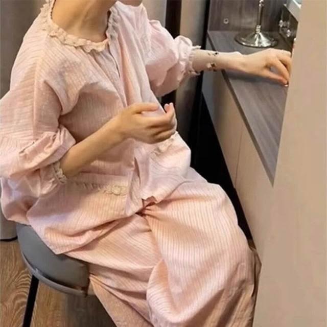 新品 含發票 睡衣女春秋季2025新款純色蕾絲花邊長袖長褲甜夏天可愛家居服套裝