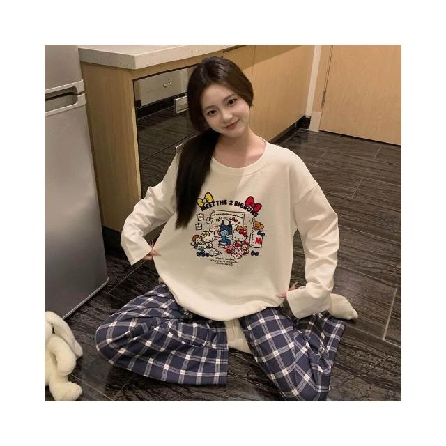 新品 含發票 純棉睡衣女春秋季款卡通可愛貓咪印花學生少女家居服長袖長褲套裝