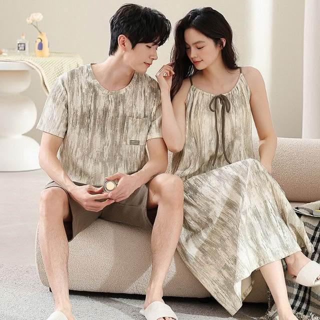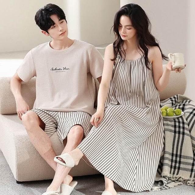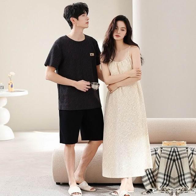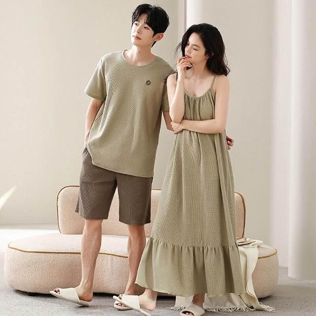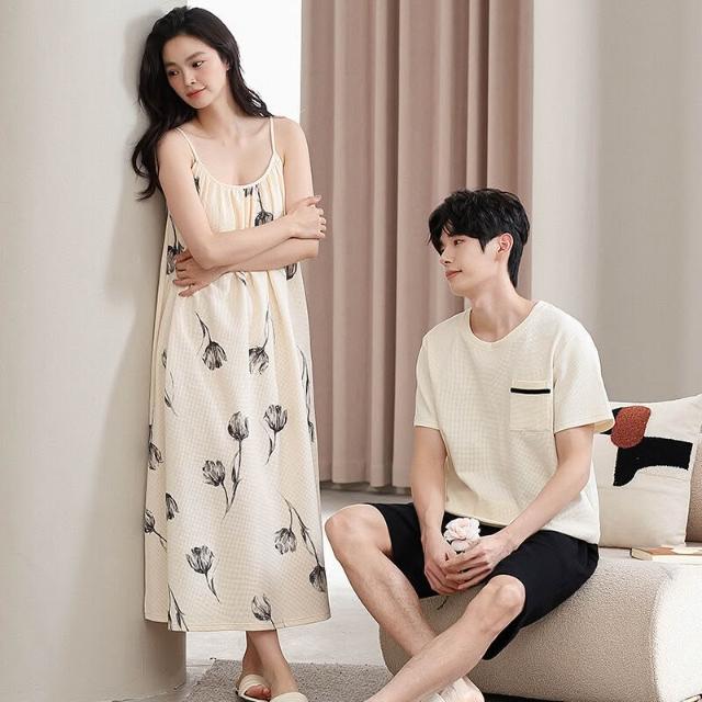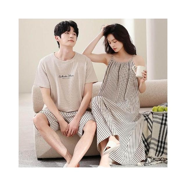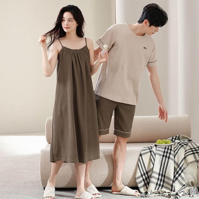 新品 含發票 情侶睡衣夏季華夫格純棉女士吊帶睡裙男士時尚短袖短褲家居服套裝