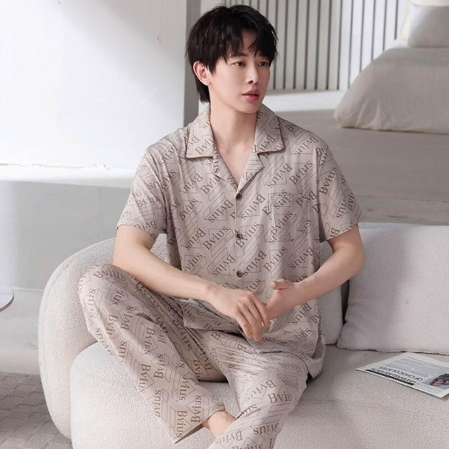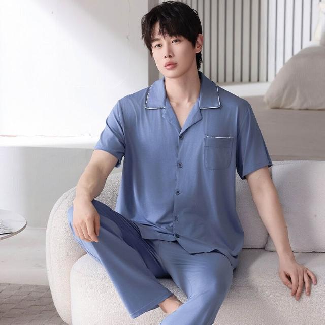 新品 含發票 夏季休閑莫代爾棉睡衣男士薄款時尚高級短袖長褲開衫家居服套裝