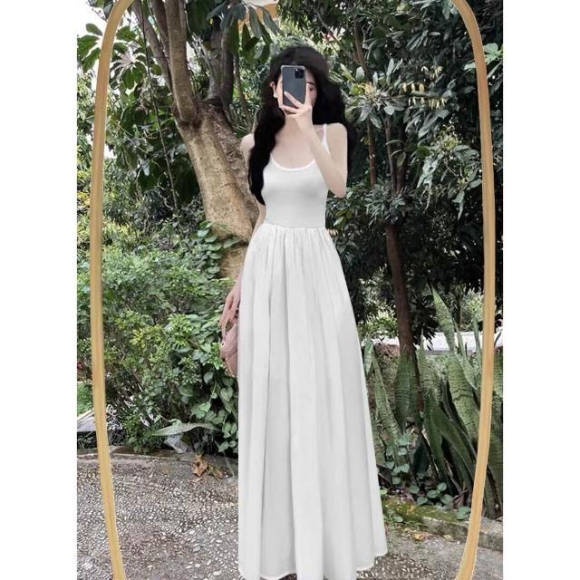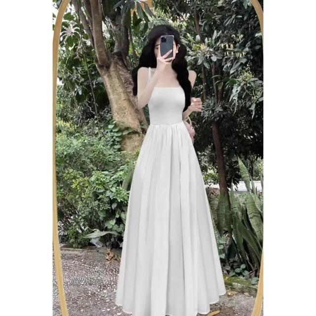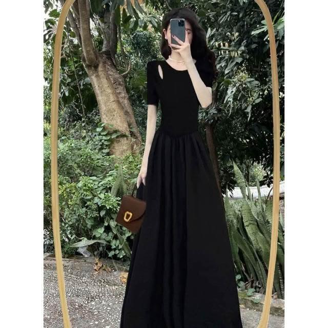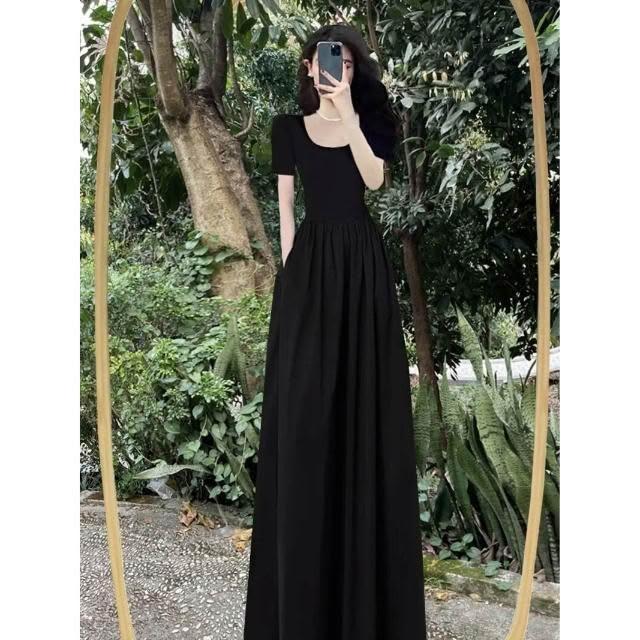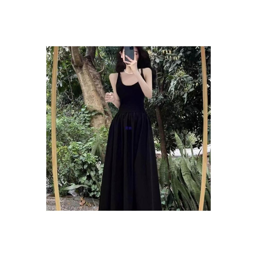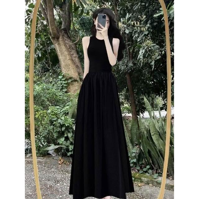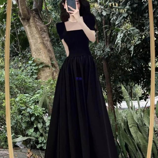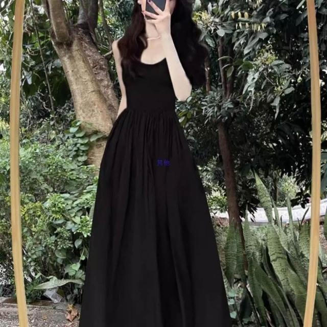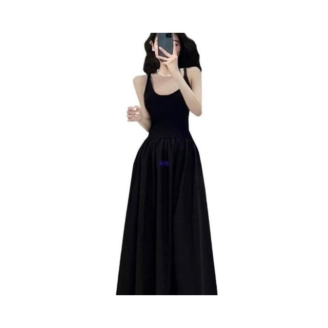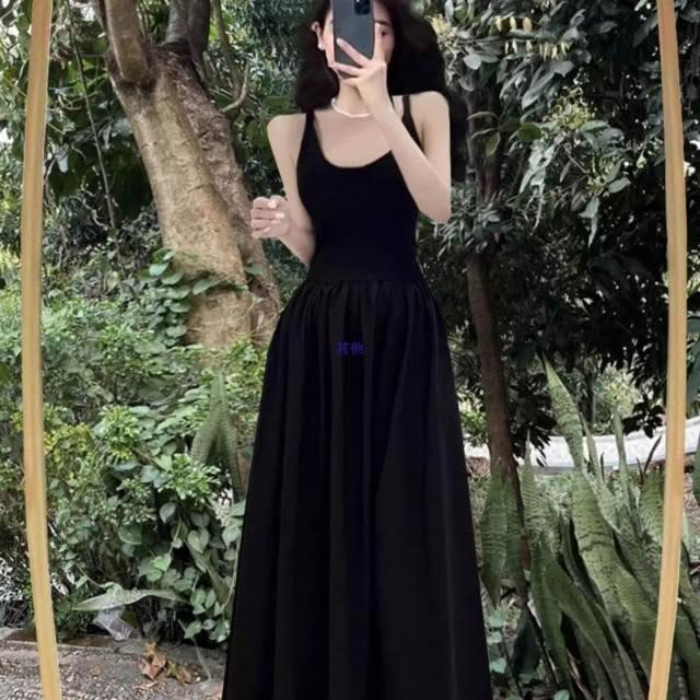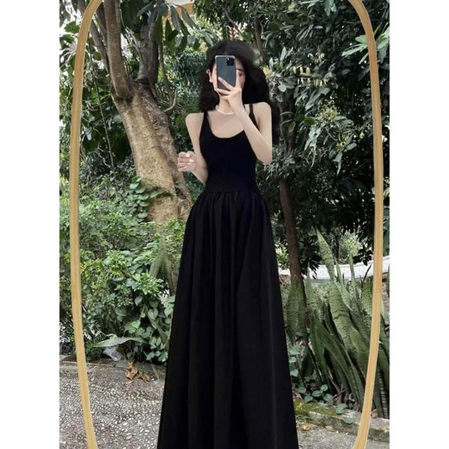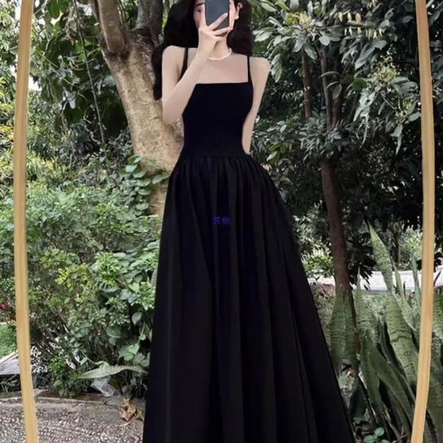 新品 含發票 赫本風連衣裙女夏法式復古收腰黑色大擺長裙吊帶小黑裙子感