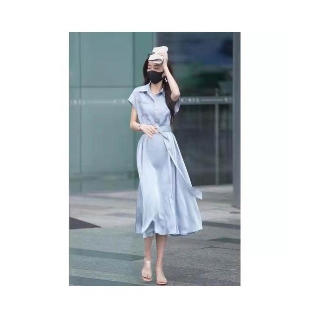 新品 含發票 法式高級感連衣裙夏季名媛風收腰襯衫裙質感藍色通勤裙子港風復古
