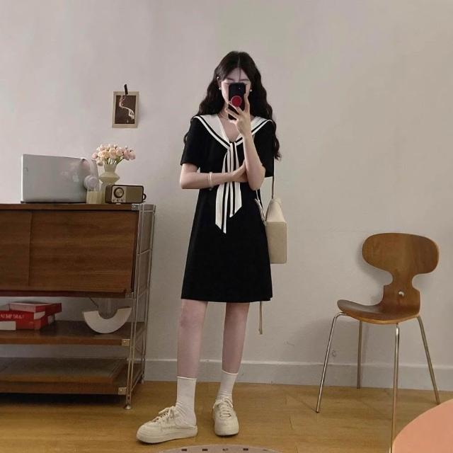 新品 含發票 2025年大碼女裝夏季韓系海軍領學院風短袖連衣裙胖MM顯瘦氣質裙子