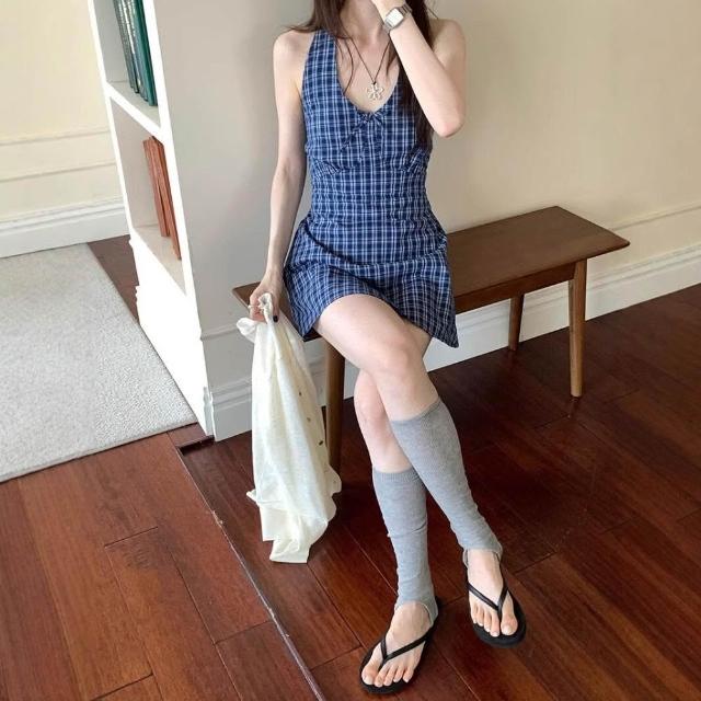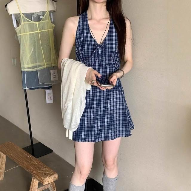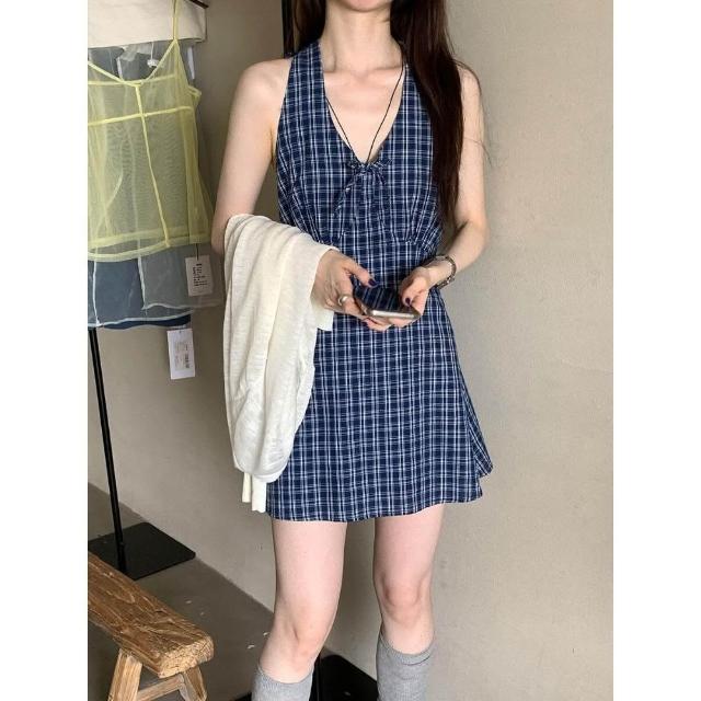 新品 含發票 藍色格子露背掛脖連衣裙女夏季新款海邊度假風a字短裙無袖v領裙子