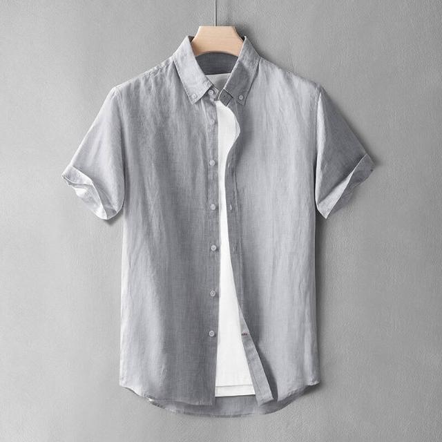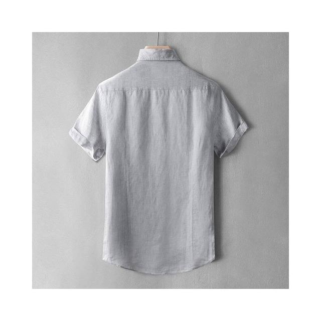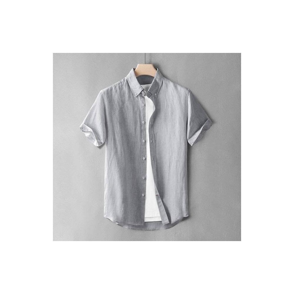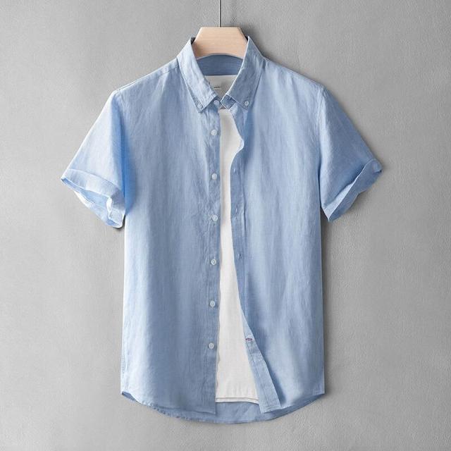 新品 含發票 色織短袖亞麻襯衫男士時尚寸衫商務休閑寬松大碼夏季襯衣薄扣領款