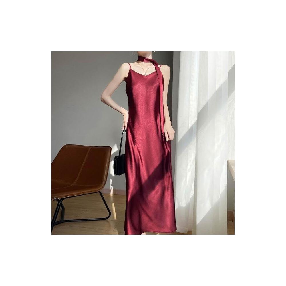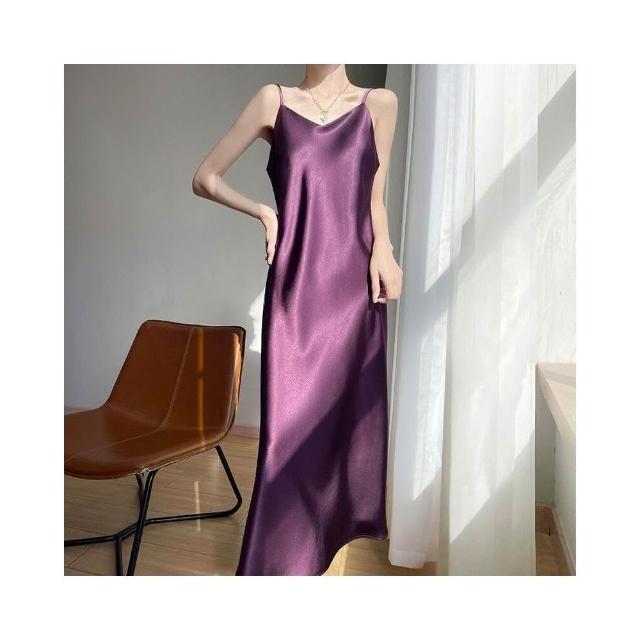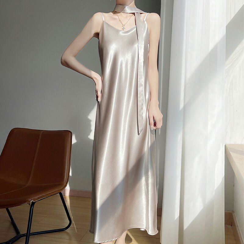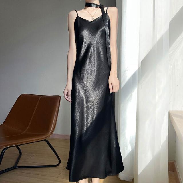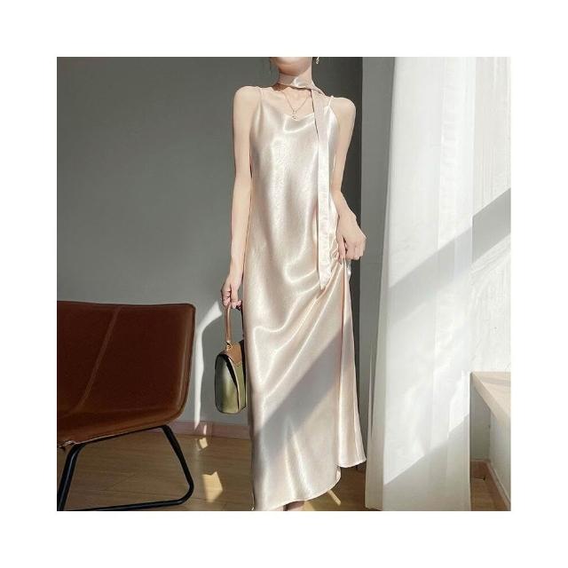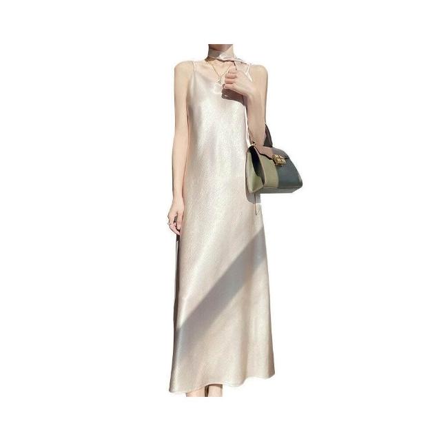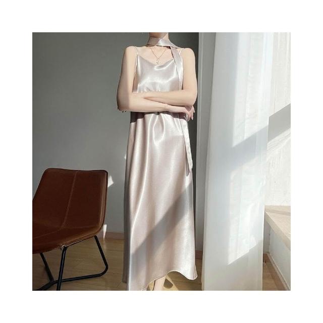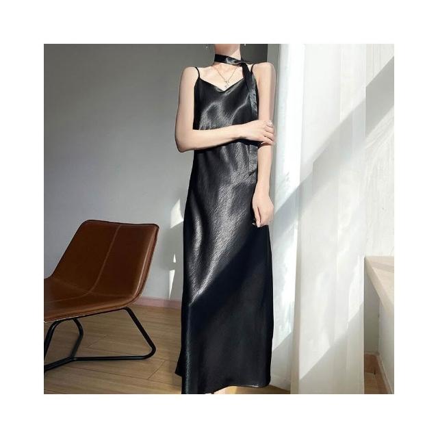 新品 含發票 2025年春夏新款鎏金緞面V領吊帶連衣裙無袖飄帶純色高腰長裙女