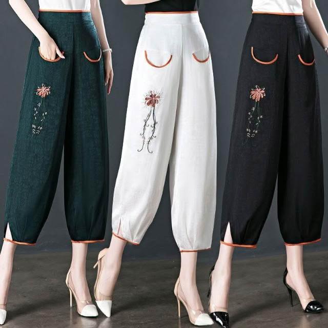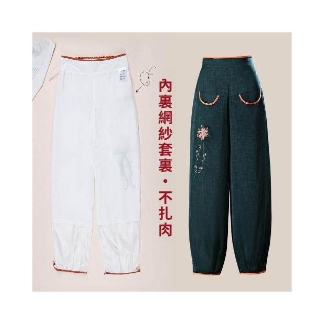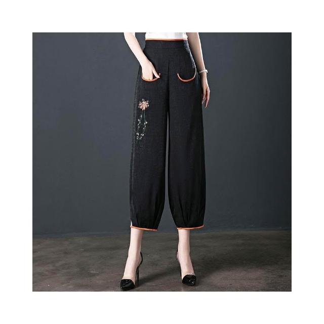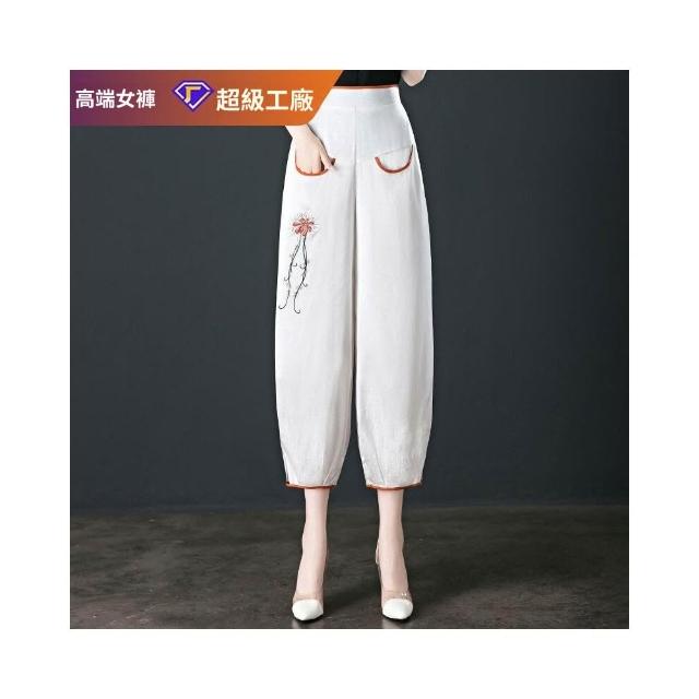 新品 含發票 新中式冰裂紋仿棉綢燈籠褲夏季女刺繡高腰寬松九分褲中老年媽媽褲