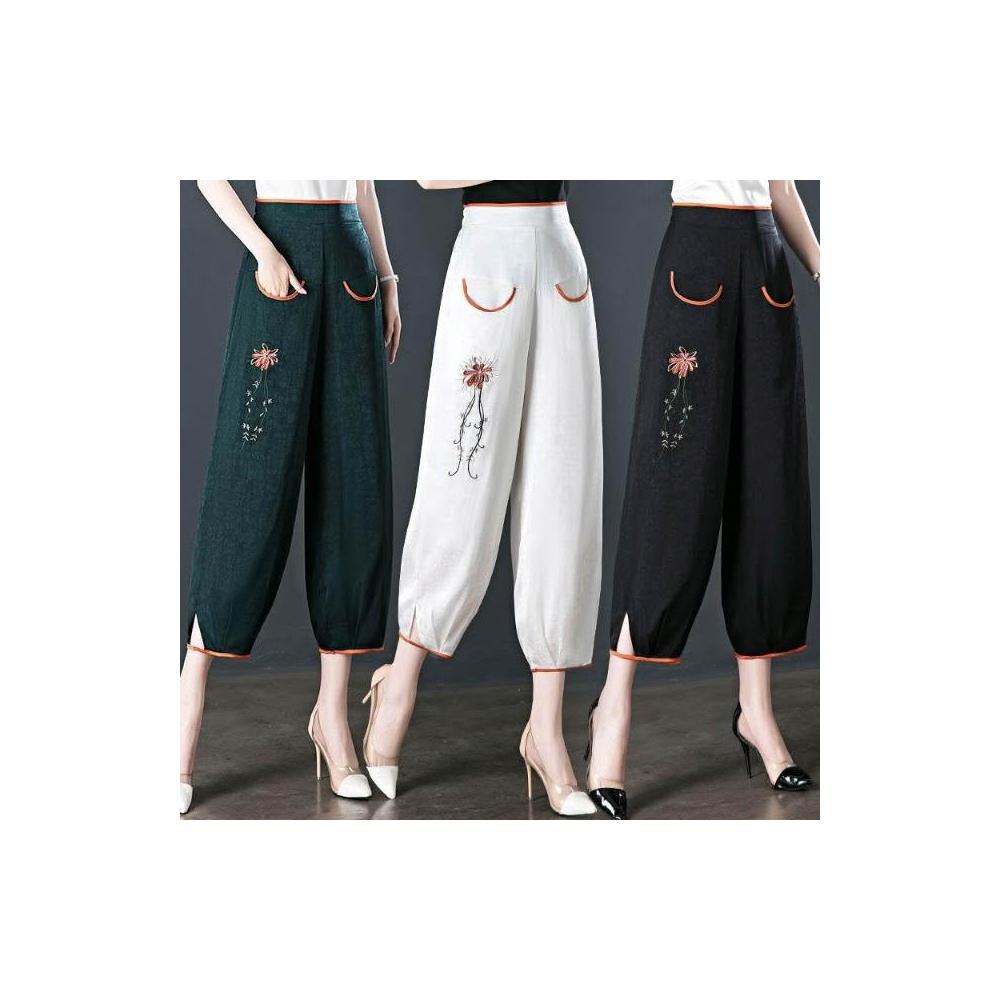 新品 含發票 新中式冰裂紋仿棉綢燈籠褲夏季女刺繡高腰寬松九分褲中老年媽媽褲