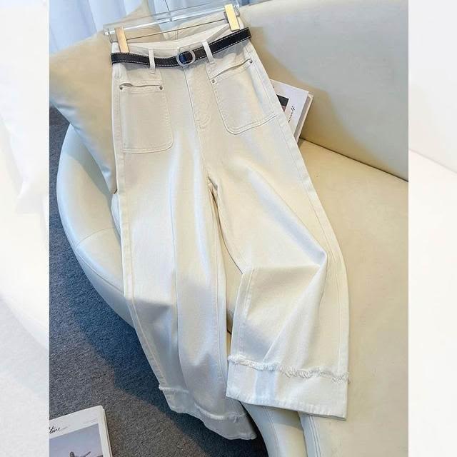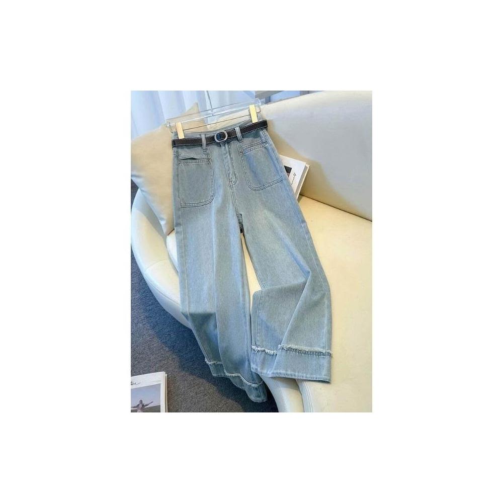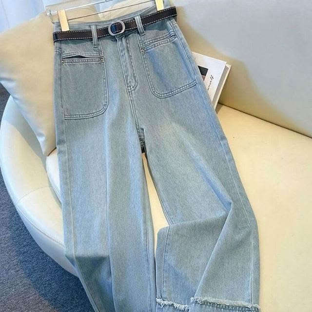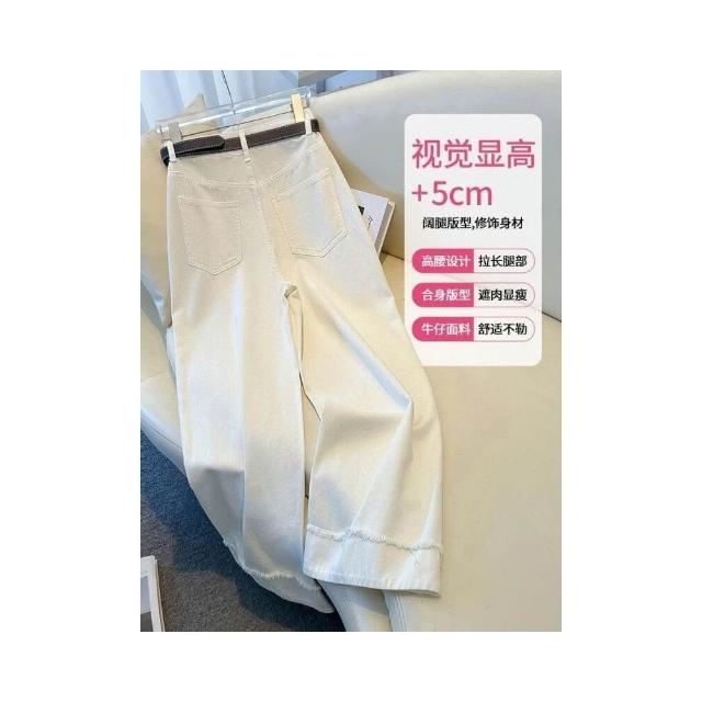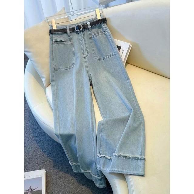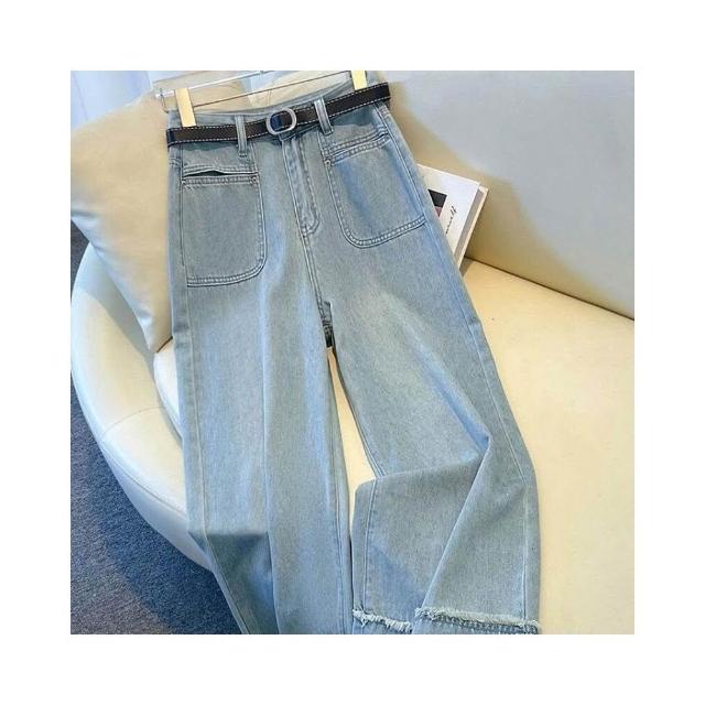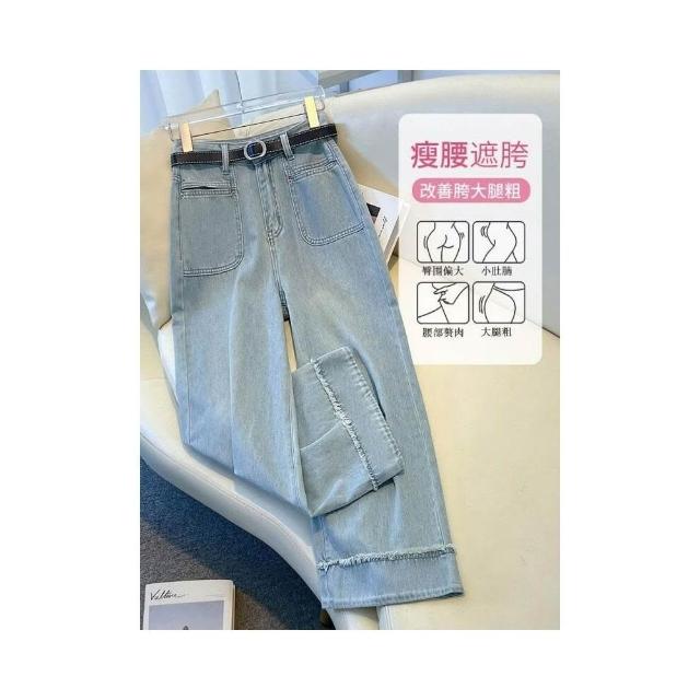 新品 含發票 高腰闊腿牛仔褲女夏季薄款2024新款垂感毛邊寬松復古九分褲直筒褲
