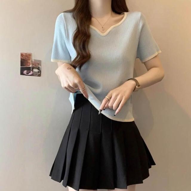 新品 含發票 法式v領正肩冰絲短袖t恤女夏季大碼胖mm顯瘦遮肚撞色短款針織上衣