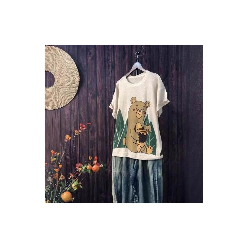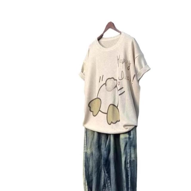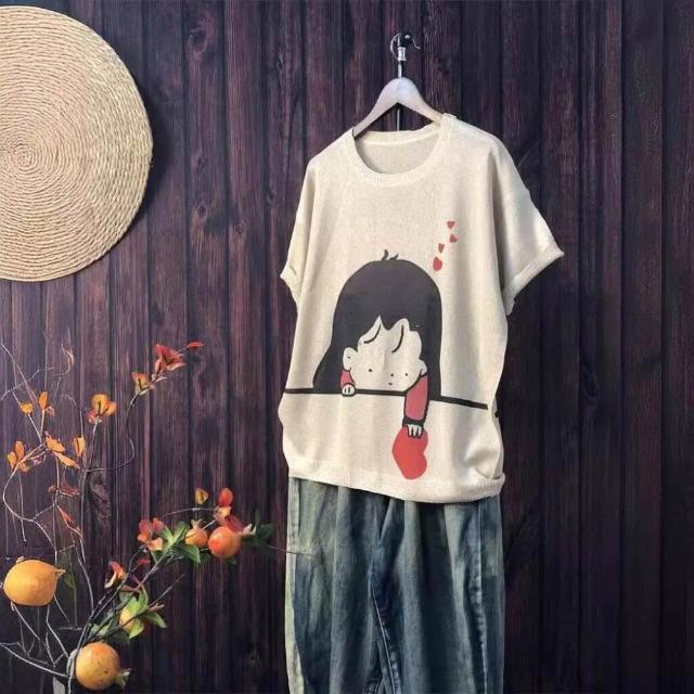 新品 含發票 2024夏季新款原創印花針織衫休閑大碼寬松初夏麻曲薄款女短袖甜美