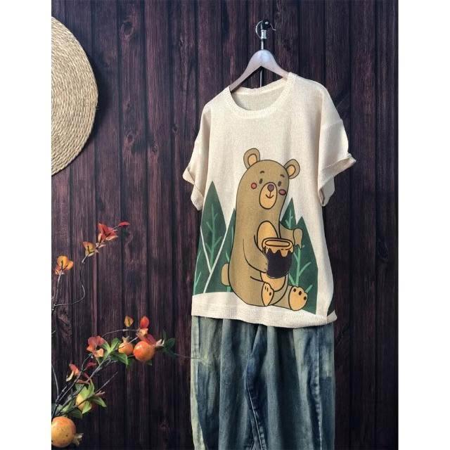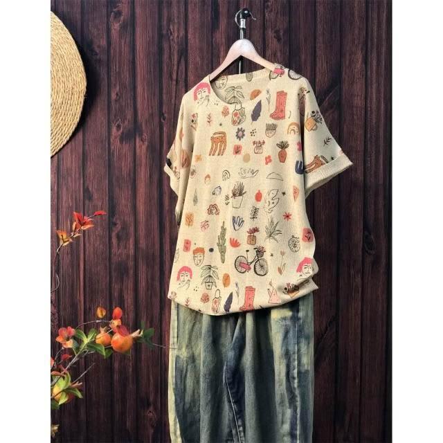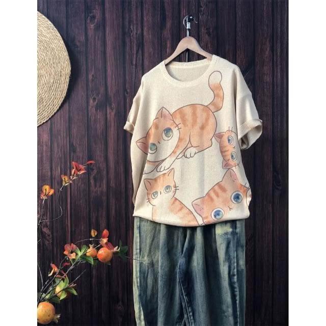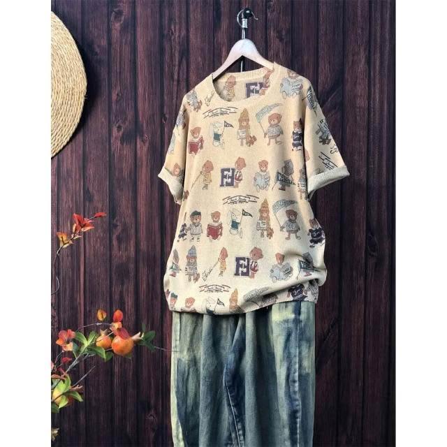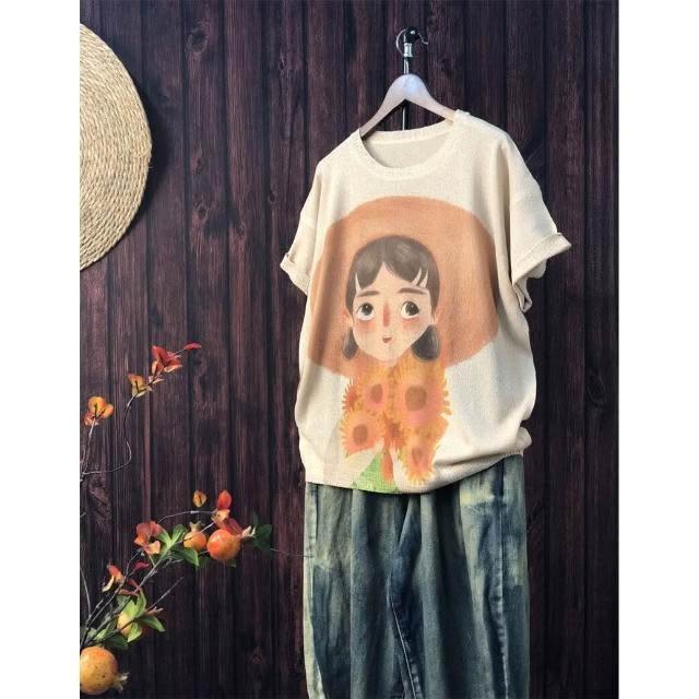 新品 含發票 2024夏季新款原創印花針織衫休閑大碼寬松初夏麻曲薄款女短袖甜美