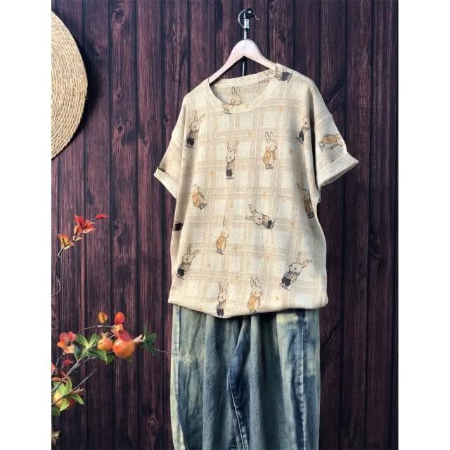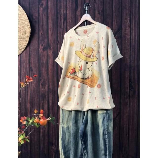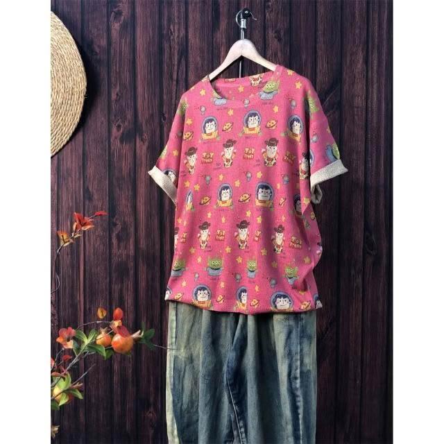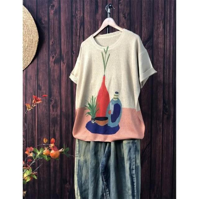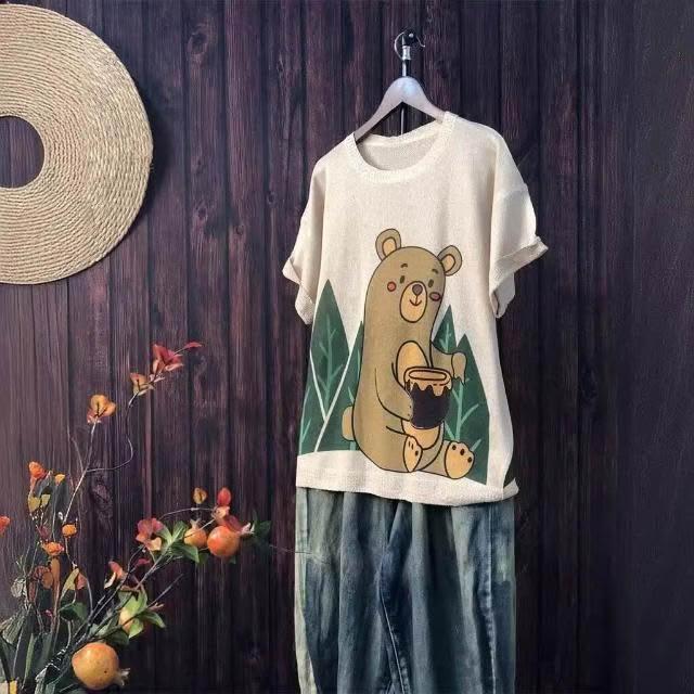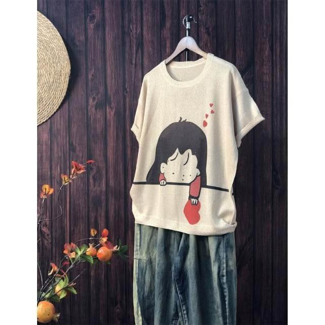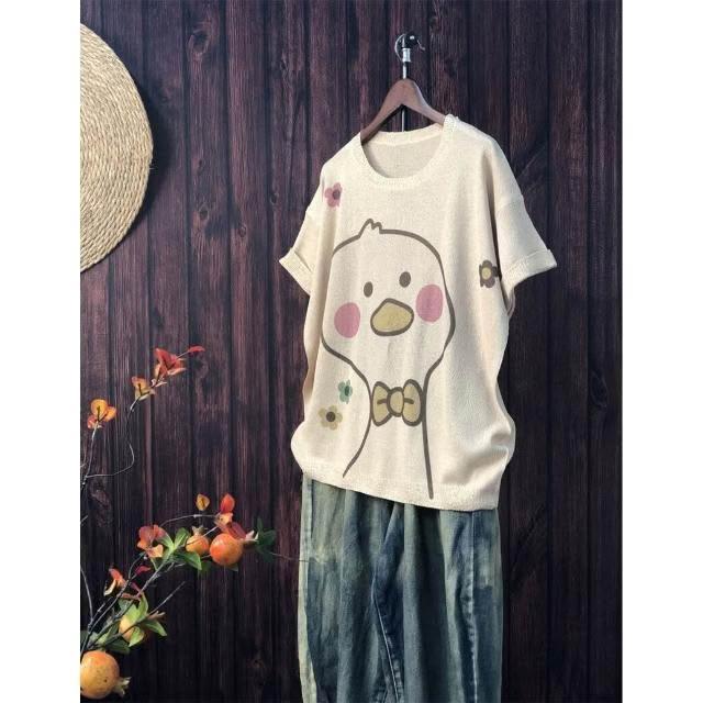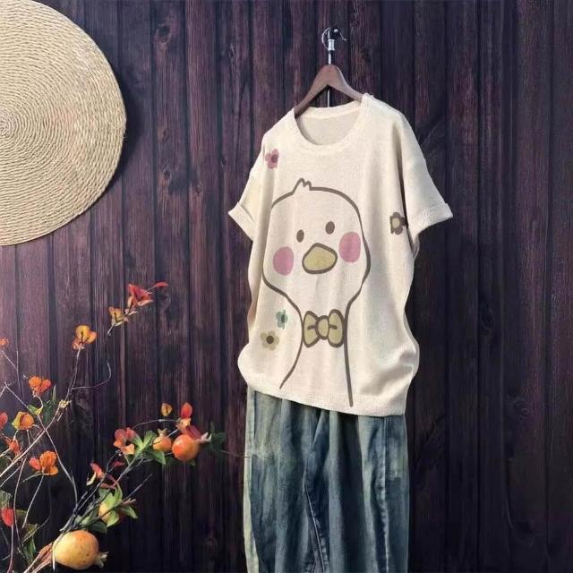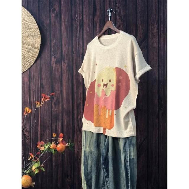 新品 含發票 2024夏季新款原創印花針織衫休閑大碼寬松初夏麻曲薄款女短袖甜美