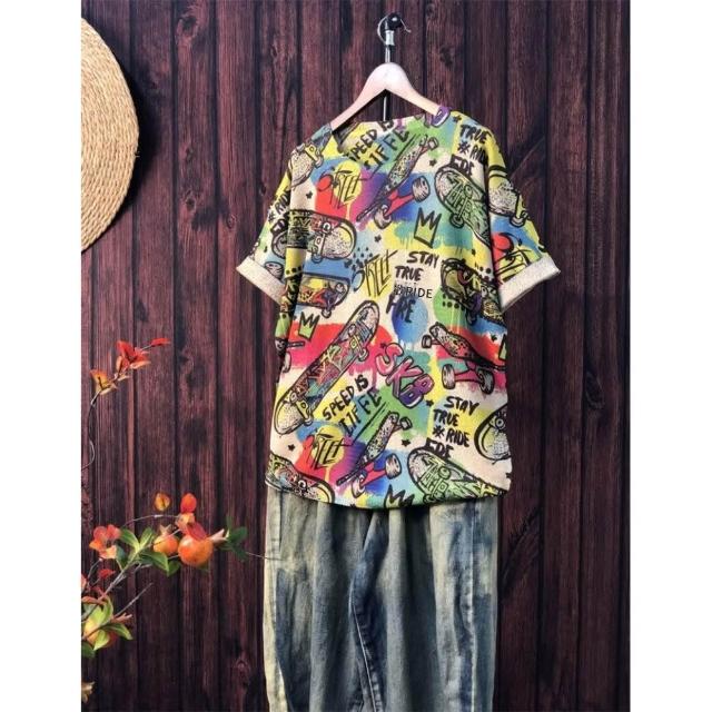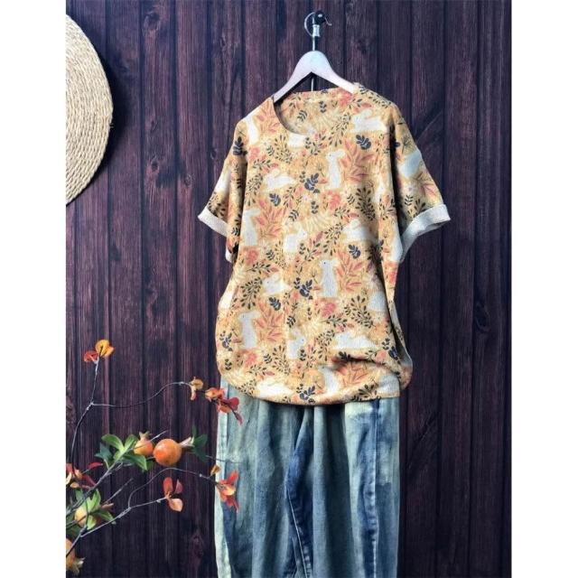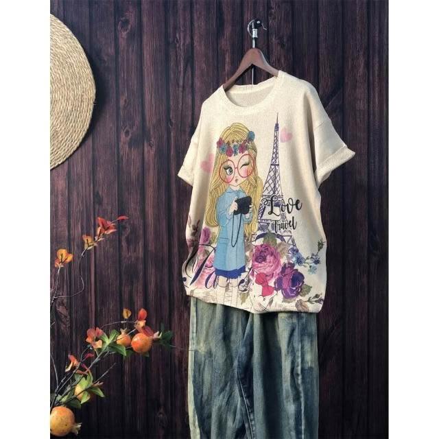 新品 含發票 2024夏季新款原創印花針織衫休閑大碼寬松初夏麻曲薄款女短袖甜美