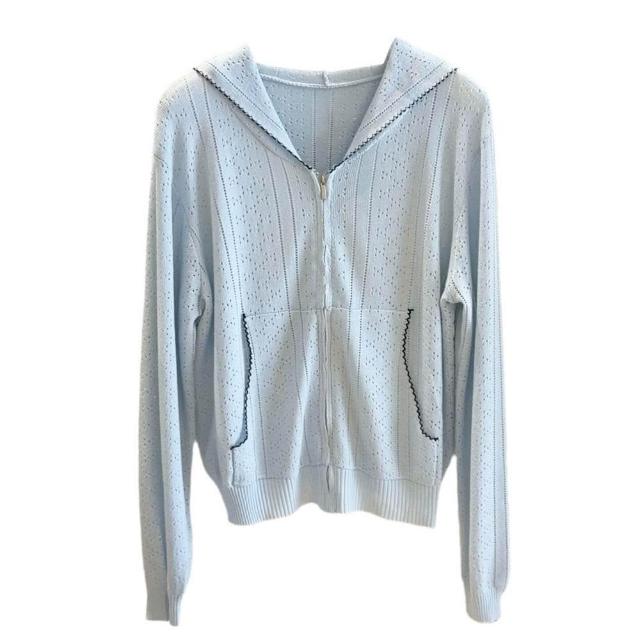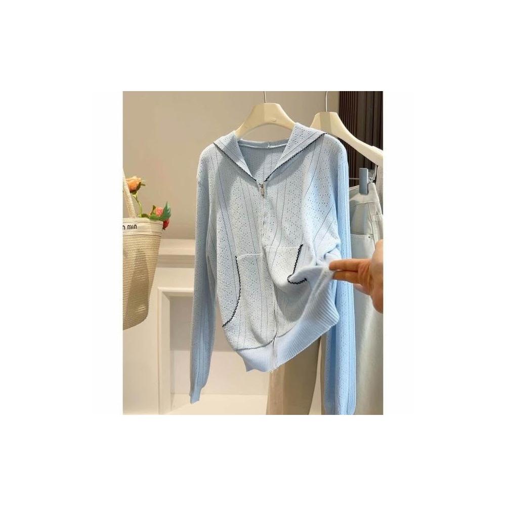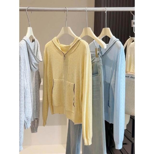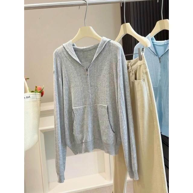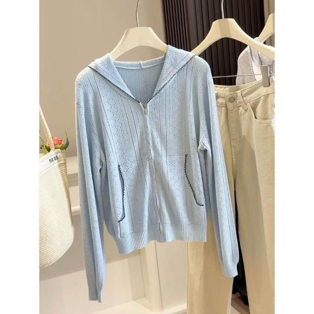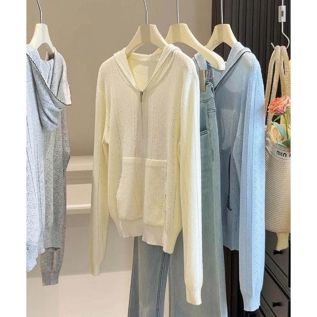 新品 含發票 薄款連帽拉鏈镂空針織開衫女春夏季新款韓版穿搭減齡顯瘦外搭上衣