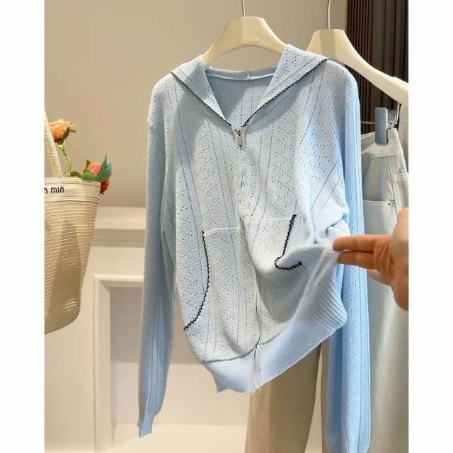 新品 含發票 薄款連帽拉鏈镂空針織開衫女春夏季新款韓版穿搭減齡顯瘦外搭上衣