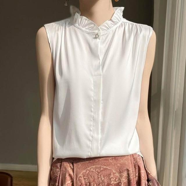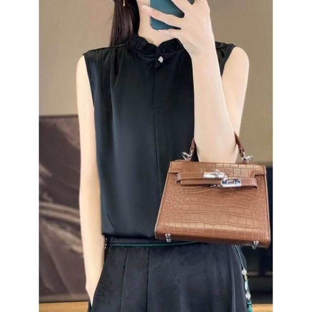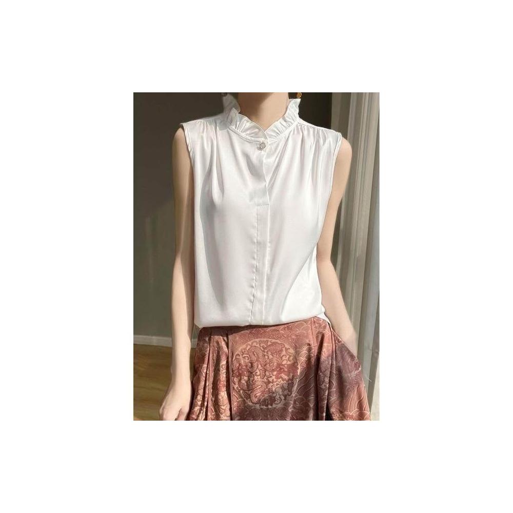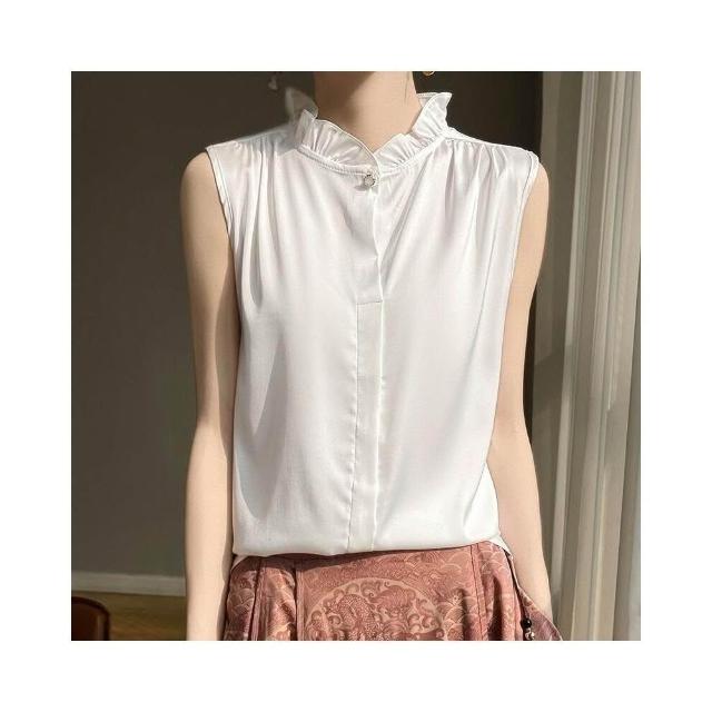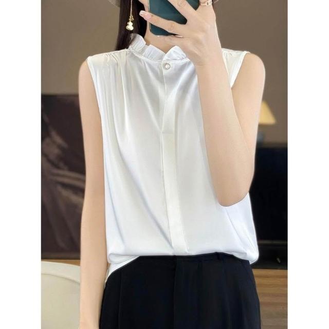 新品 含發票 木耳花邊領無袖純色一扣背心絲滑緞面通勤顯瘦春夏薄款氣質襯衫女