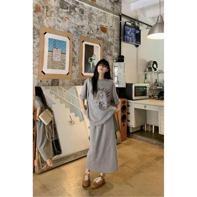 新品 含發票 美式慵懶寬松小狗印花短袖T恤高腰半身裙女2025夏季新款時尚套裝