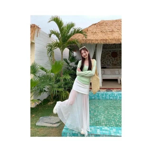 新品 含發票 薄荷綠長袖T恤薄款防曬罩衫女吊帶背心夏季網紗拼接半身裙三件套