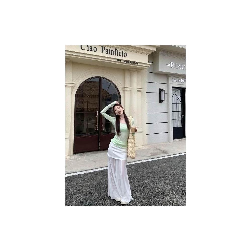 新品 含發票 薄荷綠長袖T恤薄款防曬罩衫女吊帶背心夏季網紗拼接半身裙三件套