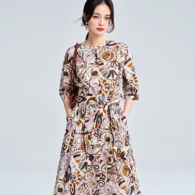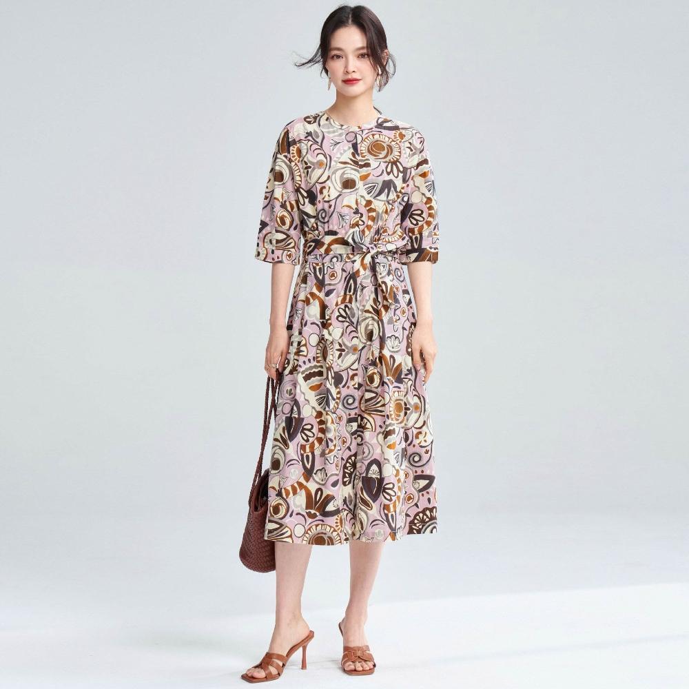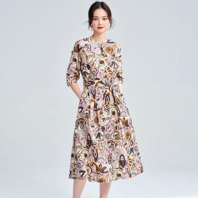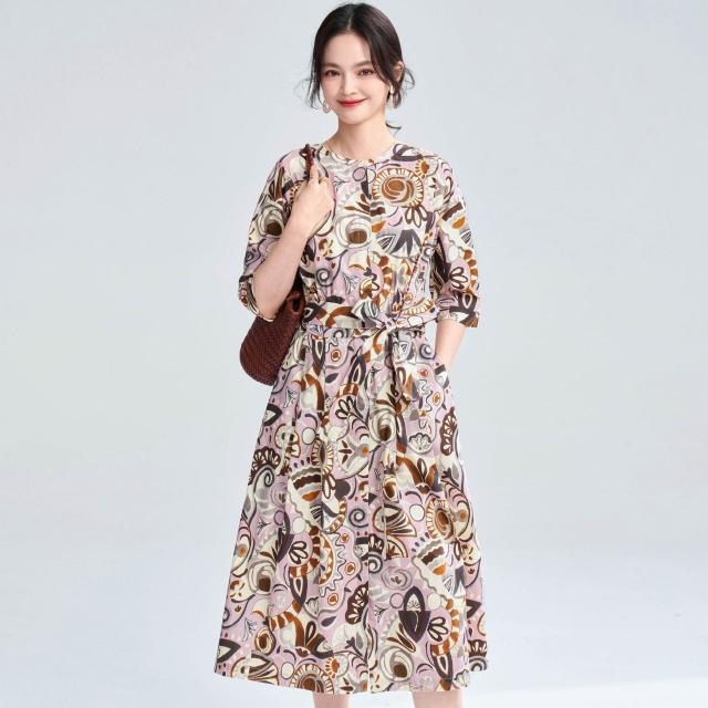 免運 含發票 春夏復古藝術花卉純棉印花收腰系帶中長連衣裙25032