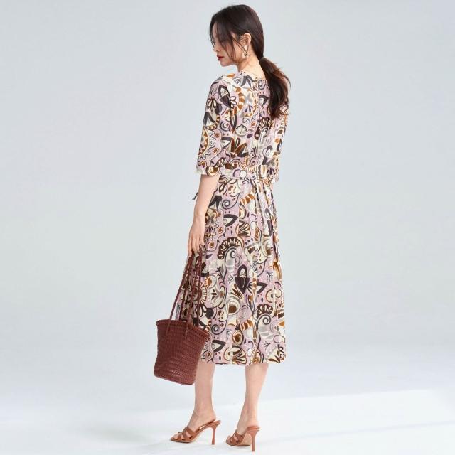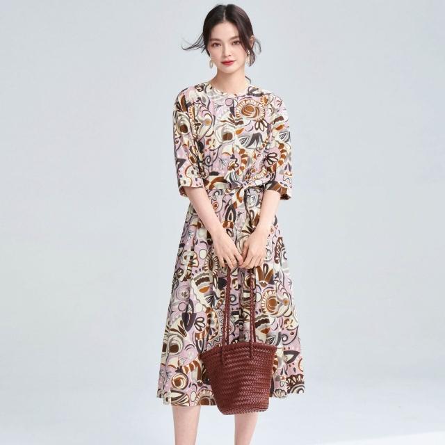 免運 含發票 春夏復古藝術花卉純棉印花收腰系帶中長連衣裙25032
