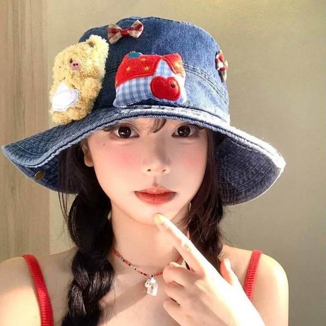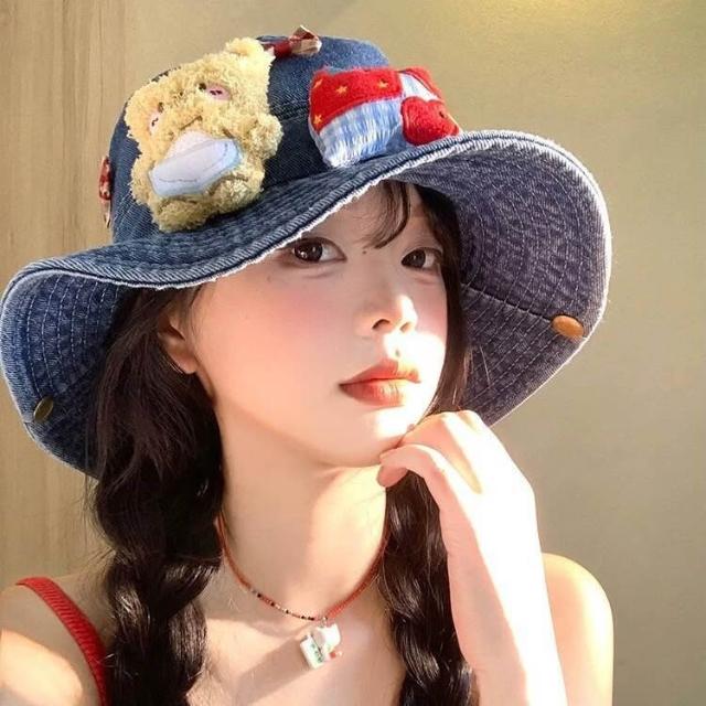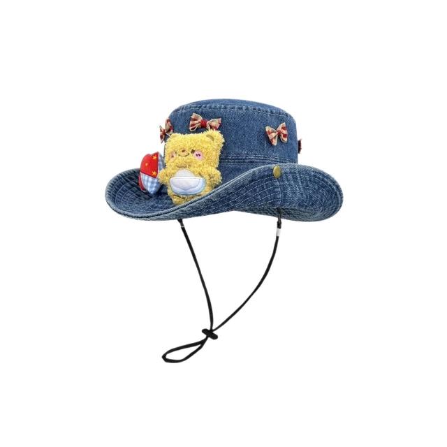 免運 免稅 可愛小熊蝴蝶結牛仔漁夫帽女夏季大帽檐顯臉小盆帽遮陽防曬帽子潮