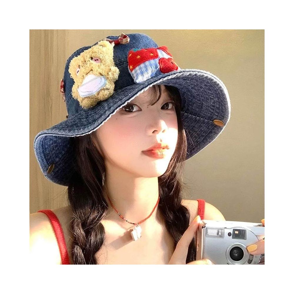 免運 免稅 可愛小熊蝴蝶結牛仔漁夫帽女夏季大帽檐顯臉小盆帽遮陽防曬帽子潮