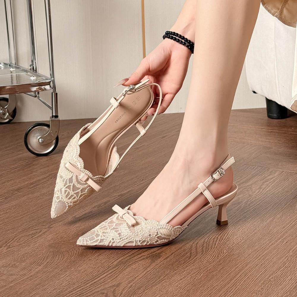免運 免稅 蝴蝶結刺繡蕾絲高跟鞋尖頭細跟不累腳顯瘦镂空涼鞋女款夏季高級感