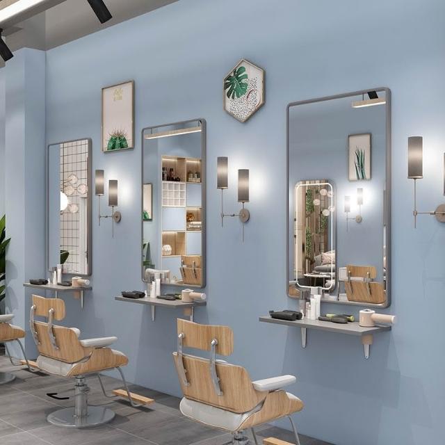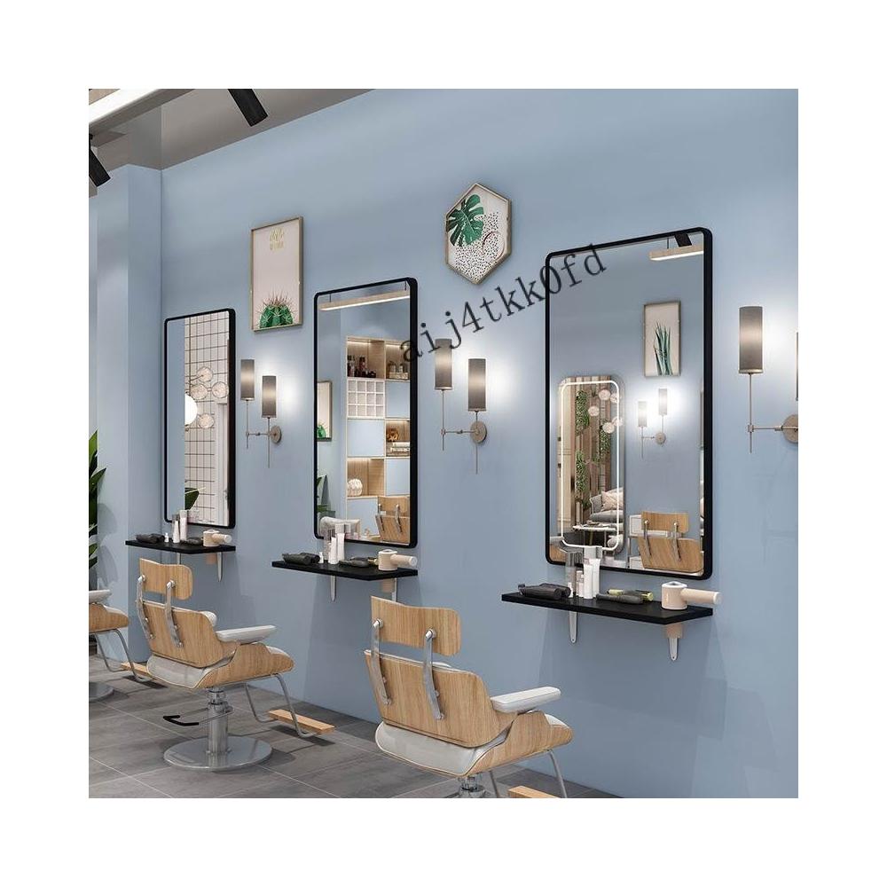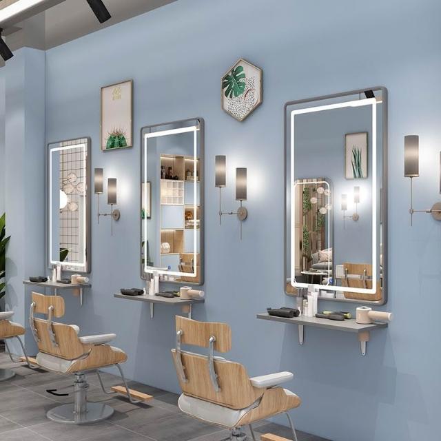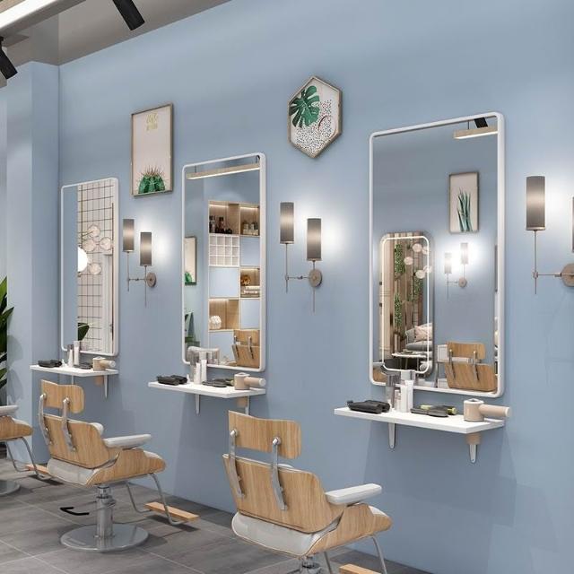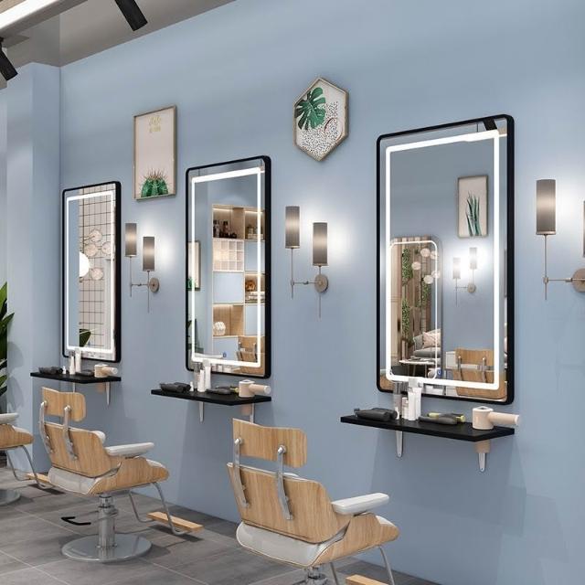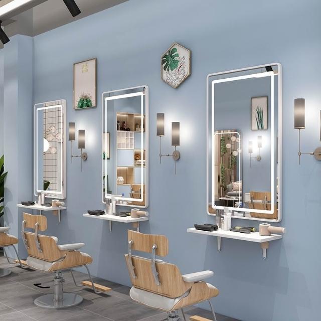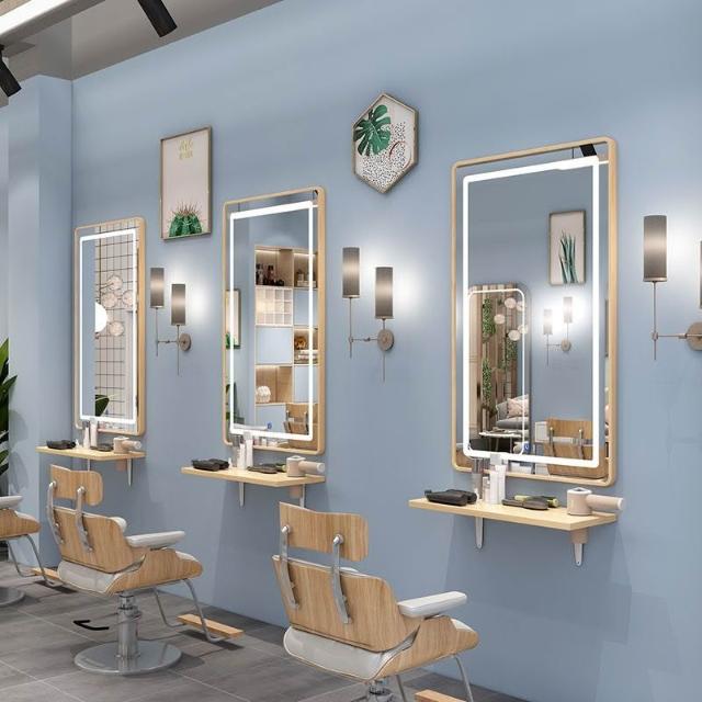 免運 批髮理髮鏡子掛墻髮廊專用美髮店剪髮鏡帶燈實木置物架高檔二閤一