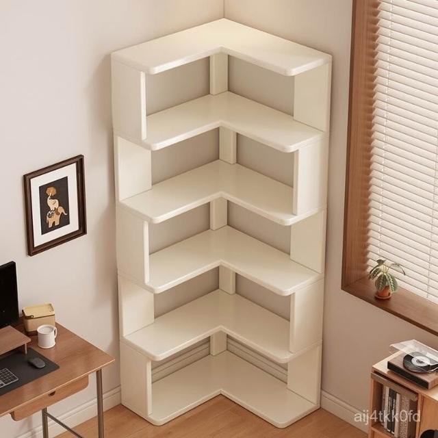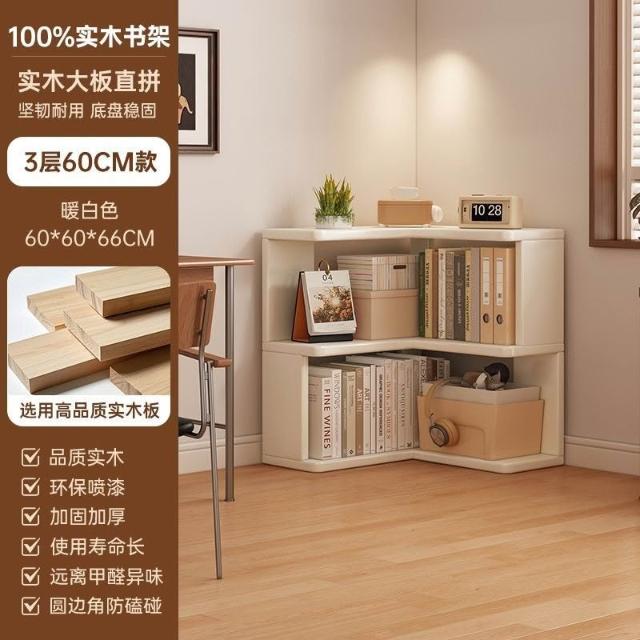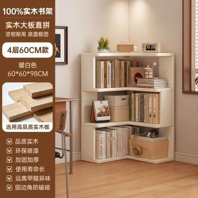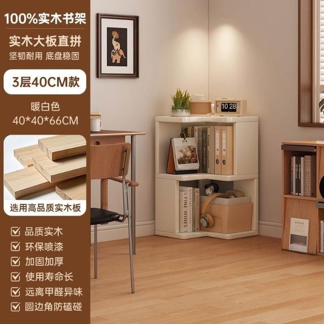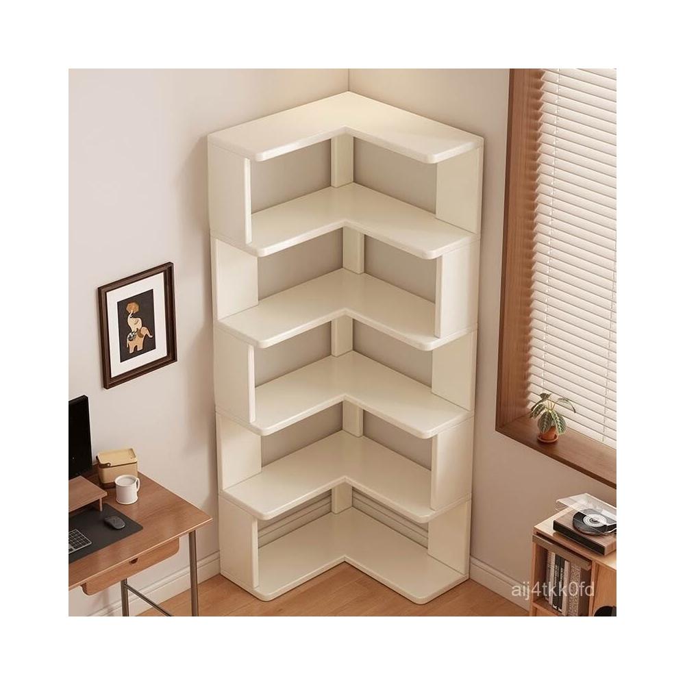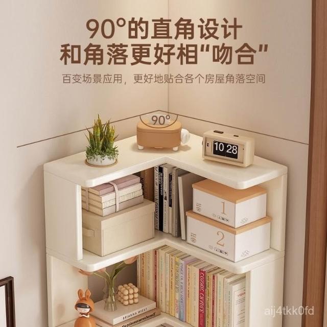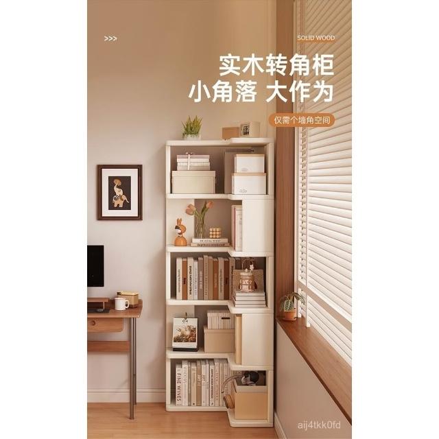 //奶油風實木書架 落地置物架 拐角書櫃 三角書本收納架子 角櫃 轉角櫃 層架