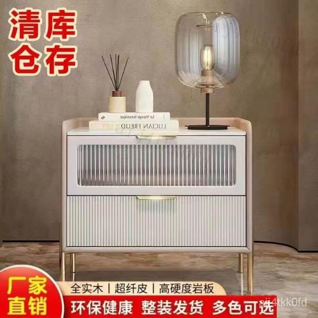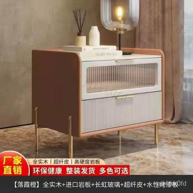 現代輕奢簡奢風床頭櫃臥室傢用高級感實木簡約玻璃皮質巖闆床邊櫃
