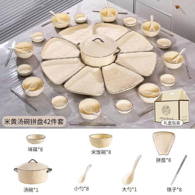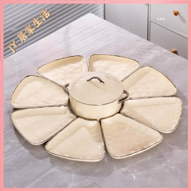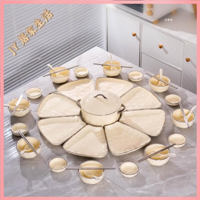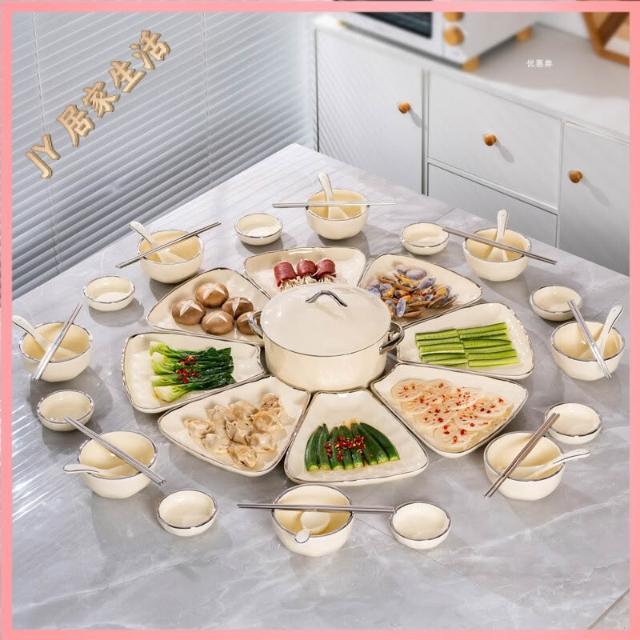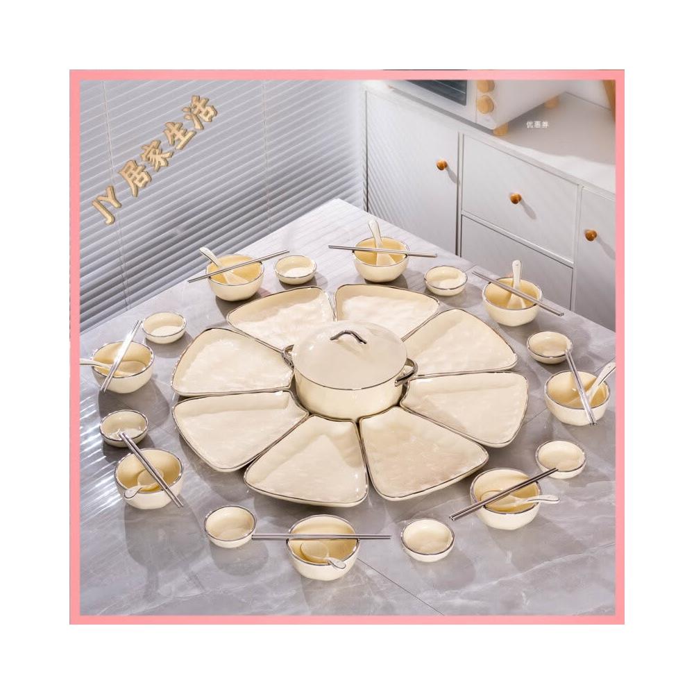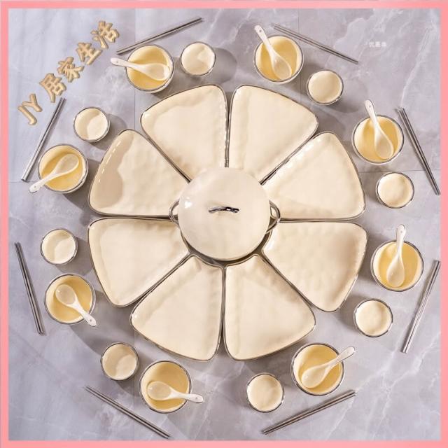 陶瓷餐盤 餐盤套裝 餐廚拚盤 組閤盤子 菜盤 陶瓷拚盤 奶油風團圓餐具圓桌拚盤組閤家用飯碗菜盤年夜飯過年聚會碗碟套