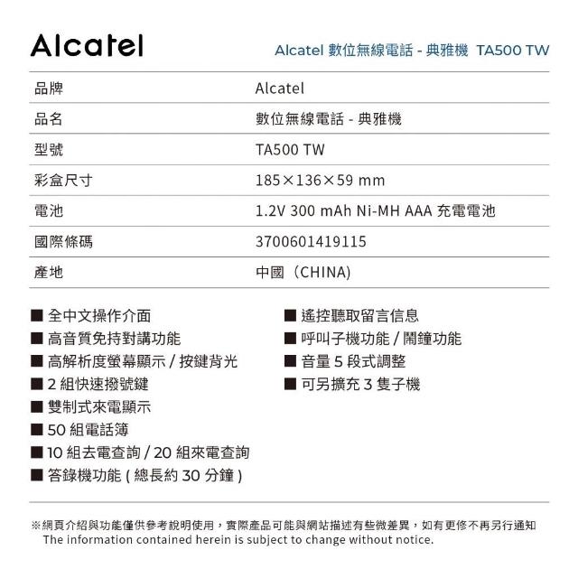 GUARD吉 ALCATEL 阿爾卡特 中文顯示數位無線答錄話機TA500TW 數位電話 無線電話 電話 中文無線電話