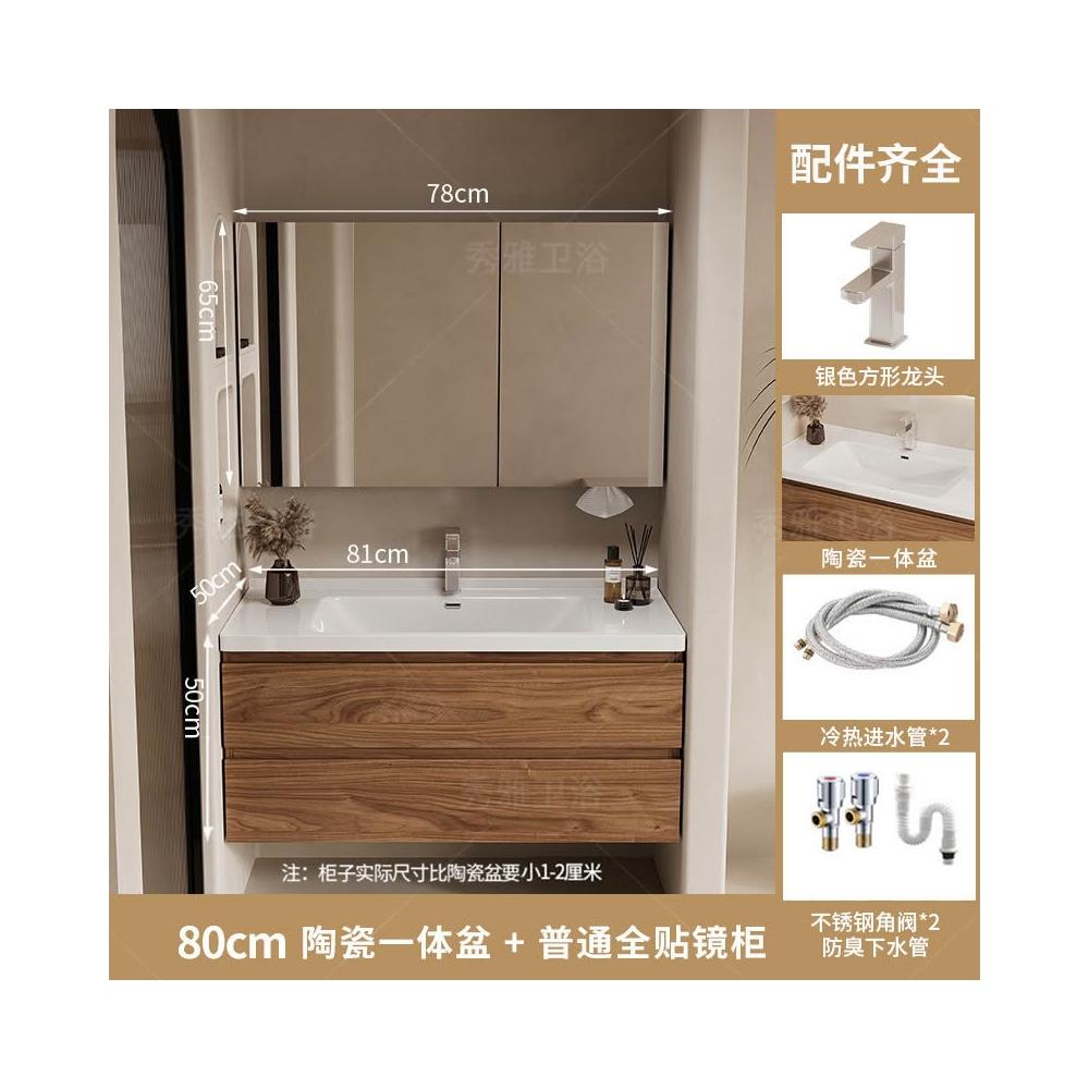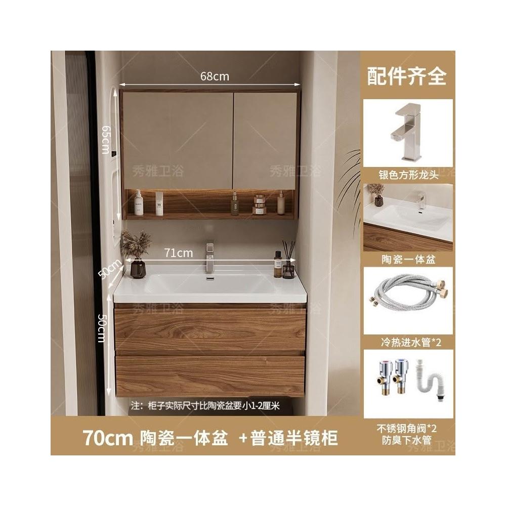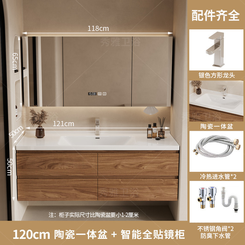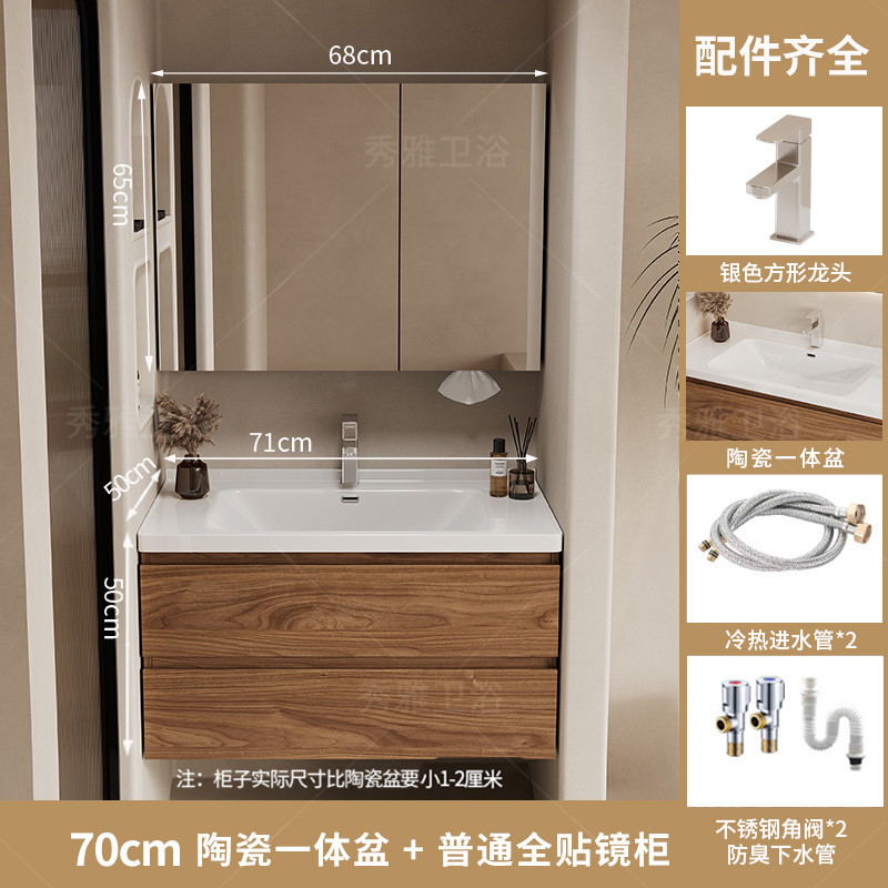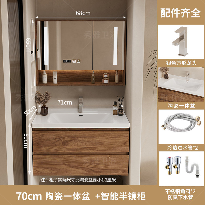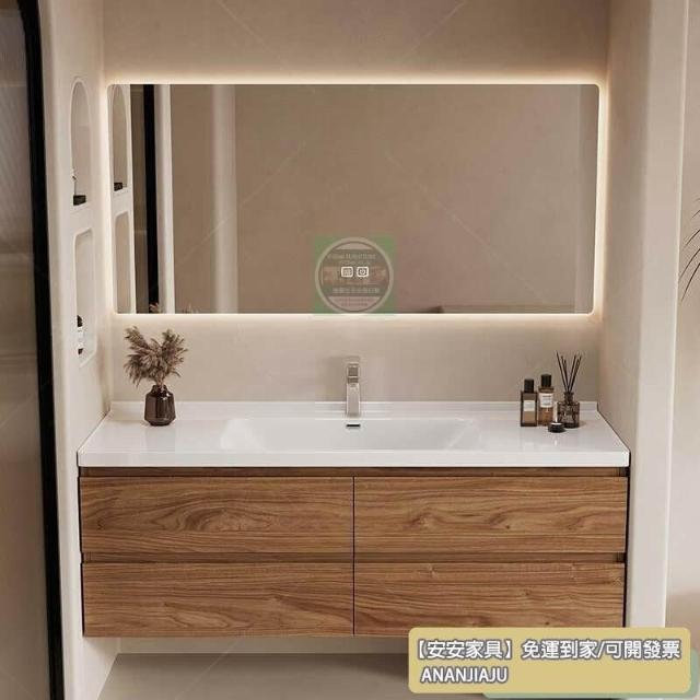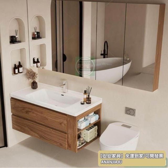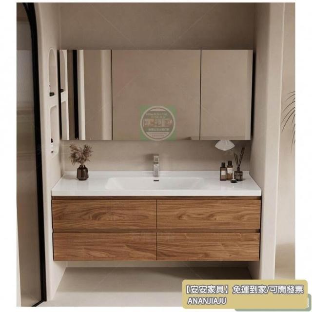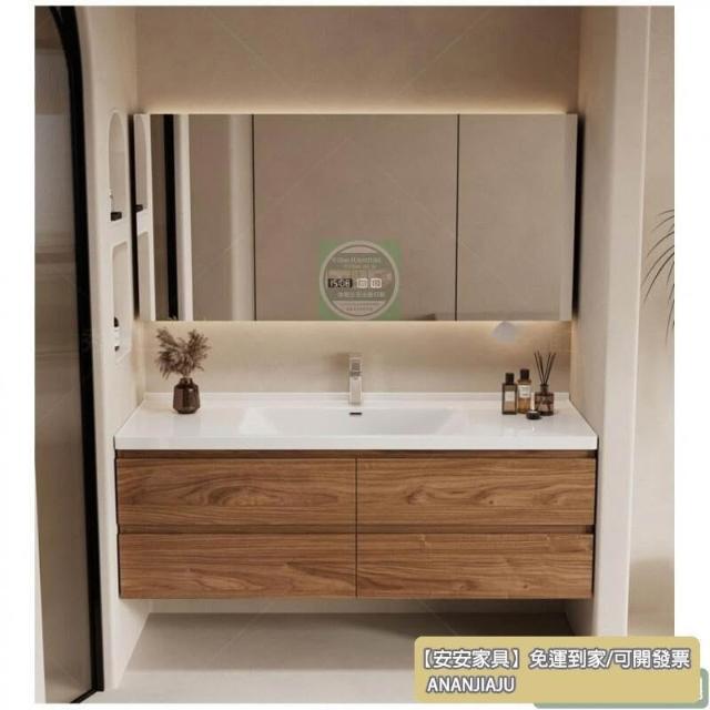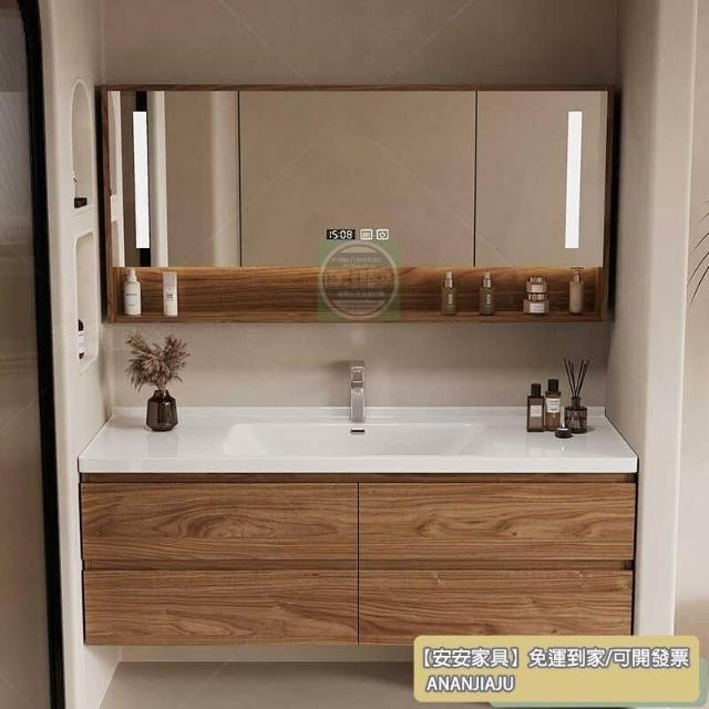 安安家具黑胡桃木色浴室櫃 陶瓷一體盆浴櫃 衛生間洗漱臺 現代簡約洗手臺 鏡櫃組合 防潮實木 多功能收納